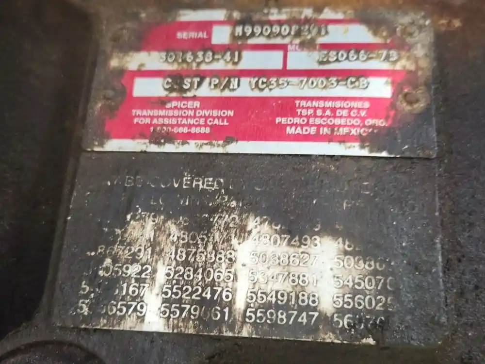 (Used) 1999 Spicer (MT), TRANSMISSION ASSEMBLY- Model: ESO66-7B, Serial Number: M990908291, Part Number: YC35-7003-CB, Engine: Caterpillar 3126, For more information about this item, give us a call. We ship Worldwide! (CRG HEAVY TRUCK PARTS) 929 W PULASKI HWY ELKTON, MD 21921, Serial#: M990908291, Engine Make: Caterpillar, Engine Model: 3126B, Casting#: M990908291