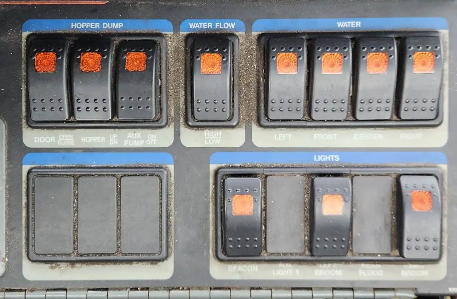 (Used) 2007 Sterling SC8000 Cargo, MISCELLANEOUS DASH SWITCHES- Controls: Sweep Mode, Hopper Dump, Water Flow, Water, Lights, Material: Aluminum with Plastic, For more information about this item, give us a call. We ship Worldwide! (CRG HEAVY TRUCK PARTS) 929 W PULASKI HWY ELKTON, MD 21921, Material: Aluminum
