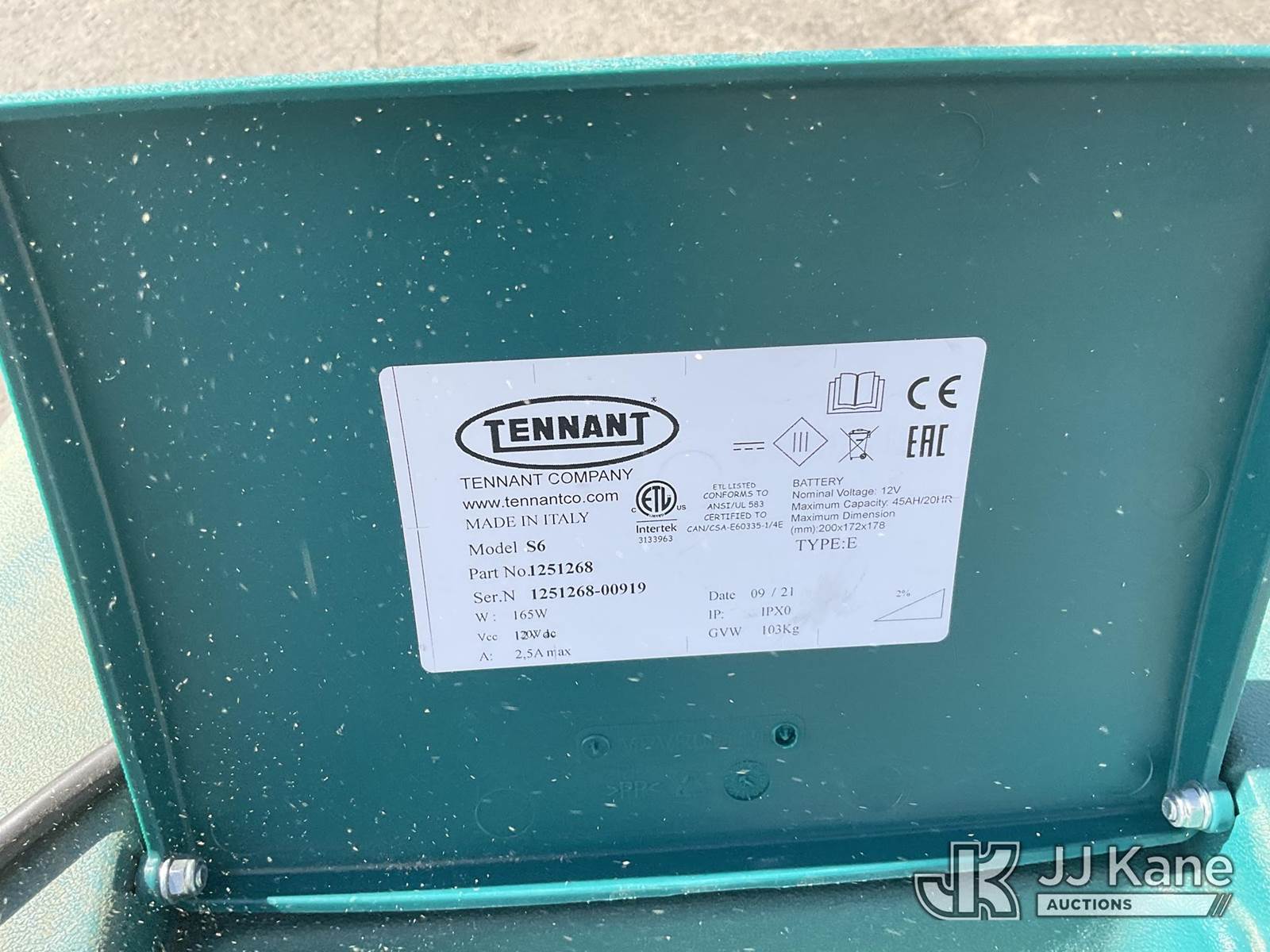 Tennant S6 s/n 1251268-00919, electric, (Out of Power, Condition Unknown) NOTE: This unit is being sold AS IS/WHERE IS via Timed Auction and is located in Dixon, CA. Inspection & preview days for this unit are the 2 business days prior to the first day of items closing for this auction, item is located at 8668 Sparling Ln Dixon, CA 95620 and hours of operations are 8a-4p. For pre-sale questions, please contact JJ Kane Staff at (707) 678-8060 (dixon@jjkane.com). Dealer License Number 45696. (Buyer is responsible for removal. Assistance by consignor or JJ Kane Auctioneers is not assured.)