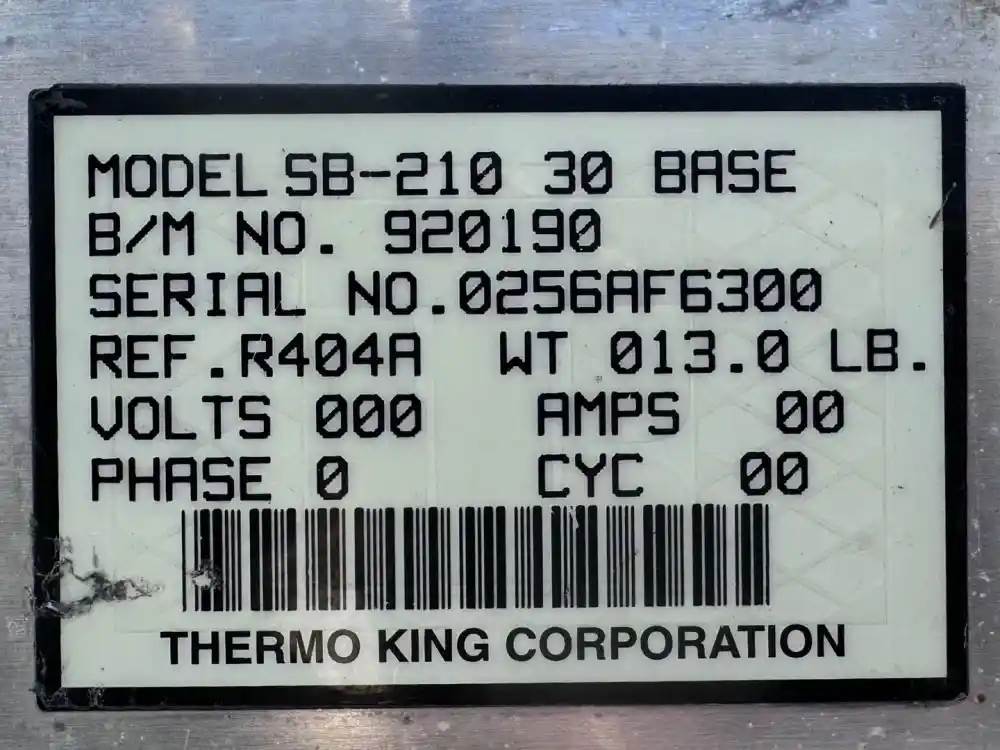 (Used) 2009 Thermo King SB-210, REEFER UNIT- Serial Number: 0256AF6300, B/M Number: 920190, Refrigerant: R404A, Hours: ??? Engine Information- Engine: Ingersoll-Rand, Model: TK486V, Serial Number: V83000, Family Number: : 9YDXL2.09K4N / YD2200DNMDEC, Displacement: 2.091L, Minor cosmetic damage, Reference images for condition. For more information about this item, give us a call. We ship Worldwide! (CRG HEAVY TRUCK PARTS) 929 W PULASKI HWY, ELKTON, MD 21921, Serial#: 0256AF6300, Engine Make: Ingersoll-Rand, Engine Model: TK486V, Casting#: 0256AF6300