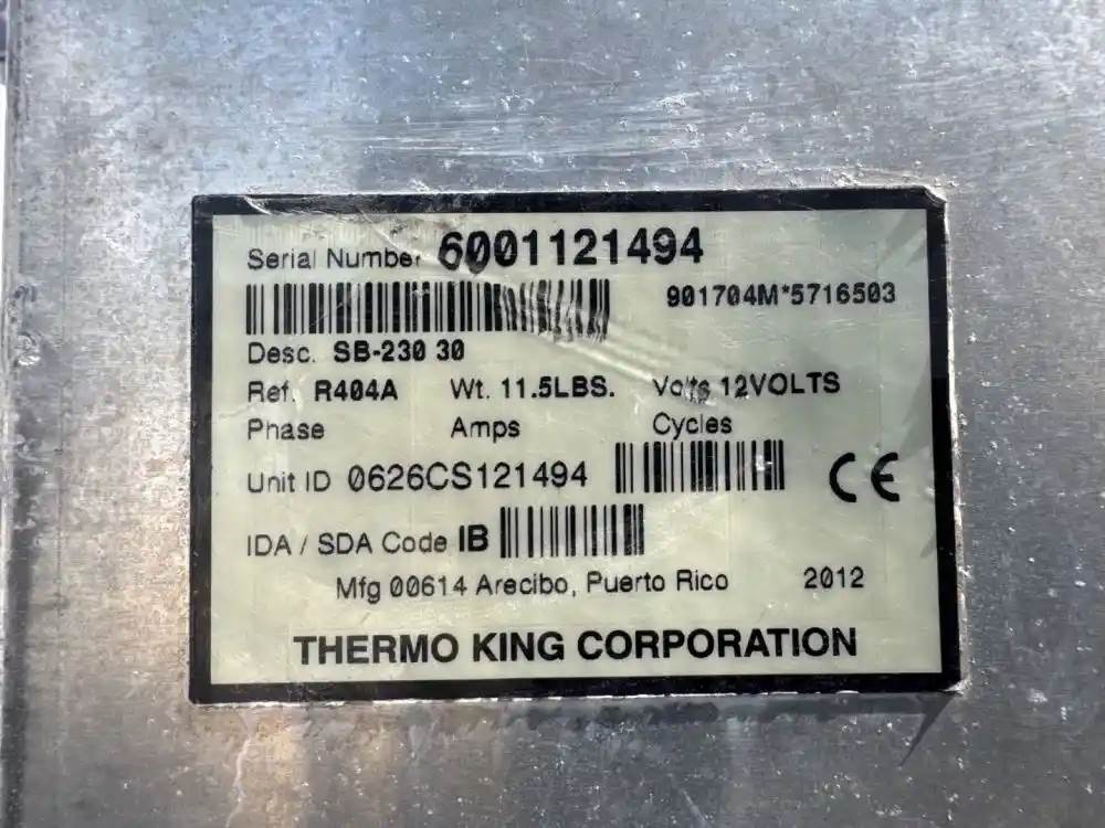 (Used) 2012 Thermo King SB-230, REEFER UNIT- Serial Number: 6001121494, ITEM Number: 901704M*5716503, Refrigerant: R404A, Hours: ? Engine Information- Engine: Ingersoll-Rand, Model: TK486V, Family Number: : 6YDXL2.09K4N / YD2200DNMDEC, Displacement: 2.091L, Minor cosmetic damage, Reference images for condition, For more information about this item, give us a call. We ship Worldwide! (CRG HEAVY TRUCK PARTS) 929 W PULASKI HWY, ELKTON, MD 21921, Serial#: 6001121494, Engine Make: Ingersoll-Rand, Engine Model: TK486V, Casting#: 6001121494