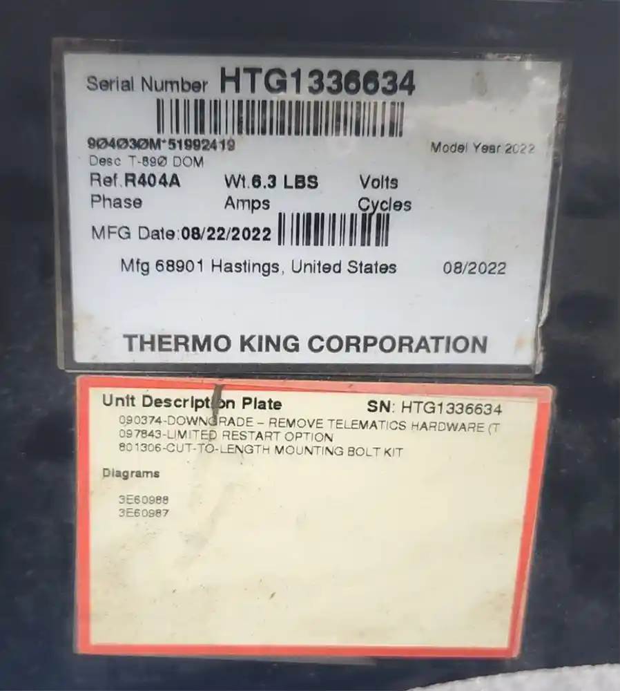 (Used) 2025 International MV607, REEFER UNIT- Part Number: 904030M*51992419, Serial Number: HTG1336634, Make: Thermo King, Model: T-890, Ref.: R404A, Wt: 6.3 Lbs, Engine Information- Serial Number: C36788, Engine Model: TK374F, Engine Family: YD099PNLNV2A, Displacement: 0.993L, E.C.S: EM, IFI, Damage Condenser, Reference images for condition, For more information about this item, give us a call. We ship Worldwide! (CRG HEAVY TRUCK PARTS) 929 W PULASKI HWY ELKTON, MD 21921, Serial#: HTG1336634, Engine Make: Cummins, Engine Model: L9, Casting#: HTG1336634