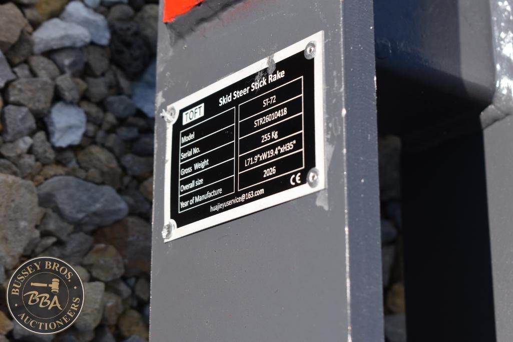 TOFT Root Rake Attachment Skid Steer Mount, hydraulic, SN#STR26010418, NEW/UNUSED