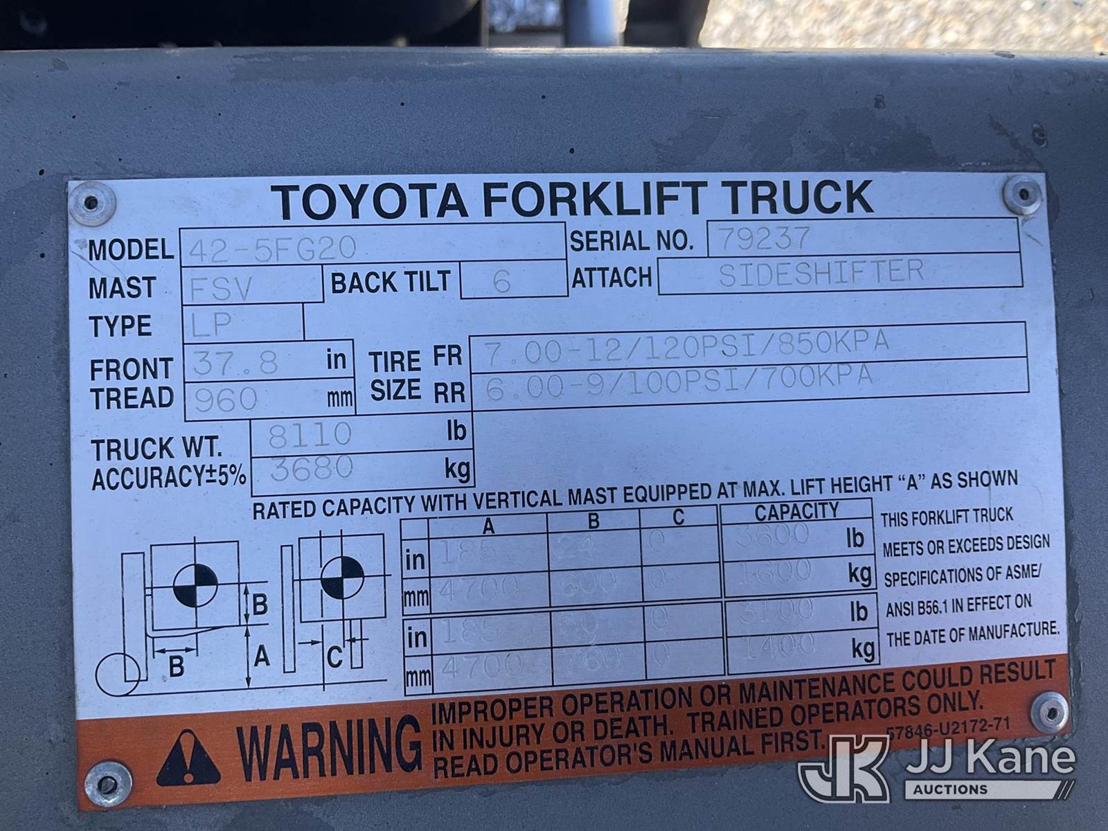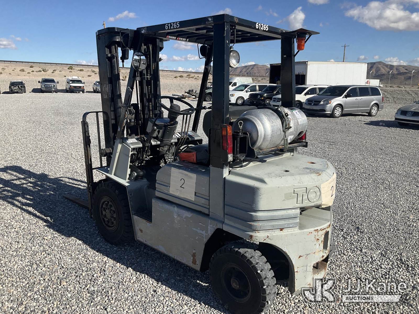 Toyota 42-5FG20 Pneumatic Tired Forklift, s/n 79237, Shuttle, LPG, with 3600lbs capacity, 185in fork height, (Runs, Moves & Operates) (Reads 10,152 hours) NOTE: This unit is being sold AS IS/WHERE IS via Timed Auction and is located in Las Vegas, NV. Inspection & preview days for this unit are the 2 business days prior to the first day of items closing for this auction, item is located at 14655 Grand Valley Pkwy Las Vegas, NV 89165 and hours of operations are 8a-4p. Titles executed exactly as bidder registered. Ensure your name and/or business name and address in JJ Kane and/or ProxiBid is correct before bidding. For pre-sale questions, please contact Office Staff @ (801) 519-0123 and provide sale date and lot number. Las Vegas Dealer License Number DLR000053086 / OHV000053094. (Buyer is responsible for removal. Assistance by consignor or JJ Kane Auctions is not assured.)