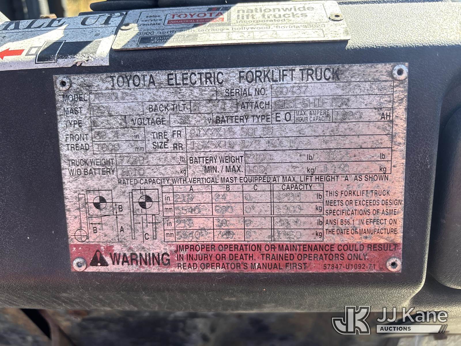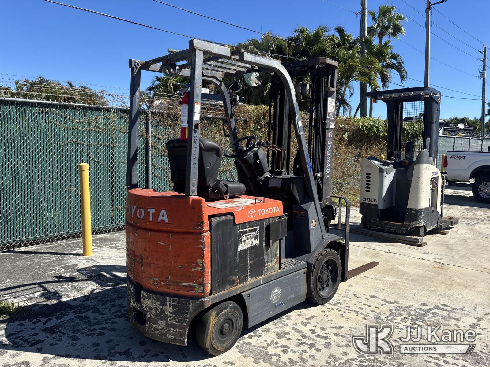 Toyota 7FBCU25 Solid Tired Forklift, s/n 60437, battery powered, Shuttle, with 4,200 lb. lift capacity, 218 in. mast height, 4 ft. forks & ROPS, (Not Running, Condition Unknown) (Body & Paint Damage, No Hours Displayed) NOTE: This unit is being sold AS IS/WHERE IS via Timed Auction and is located in Riviera Beach, FL. An inspection day for FPL auction items will be conducted on the Friday before the auction from 8a-3p at 2455 Port West Boulevard, Riviera Beach, FL 33407. Winning Buyer/Hauler must present copy of paid invoice upon arrival to pick up. For load out and pick up information, please reference the release form sent out after purchase. Any more information please call Andy Garcia @ 561-215-0085. (Buyer is responsible for removal. Assistance by consignor or JJ Kane Auctions is not assured.)