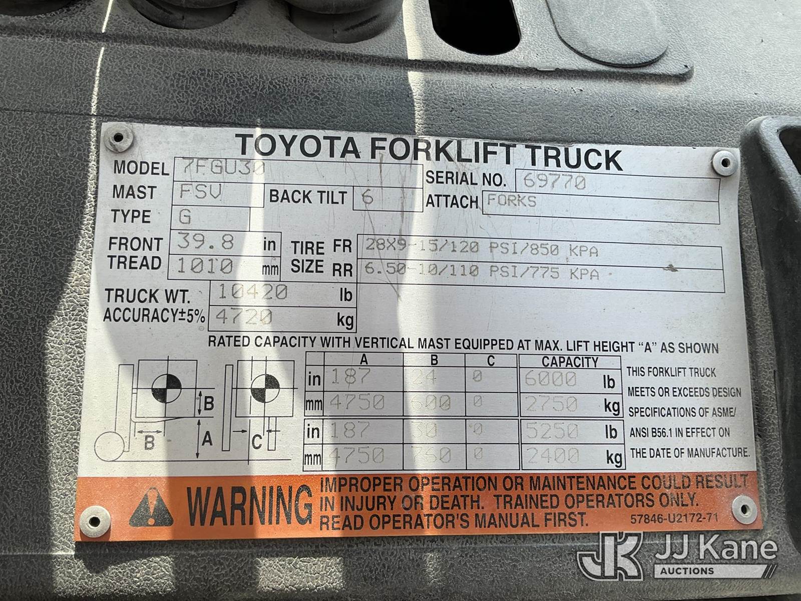 Toyota 7FGU30 Solid Tired Forklift, s/n 69770, 4-cyl gas, Shuttle, with 187in 3 stage mast, 48in forks, in & out, EROPS w/heat, (Runs, Moves & Operates ) (Reads 6,042 hours) NOTE: This unit is being sold AS IS/WHERE IS via Timed Auction and is located in China Grove, NC. Inspection & preview days for this unit are the 2 business days prior to the first day of items closing for this auction, item is located at 820 E NC Hwy 152 China Grove, NC 28023 and hours of operations are 8a-4p. For pre-sale questions, please contact Office Staff @ (704) 674-1113. (Buyer is responsible for removal. Assistance by consignor or JJ Kane Auctions is not assured.)