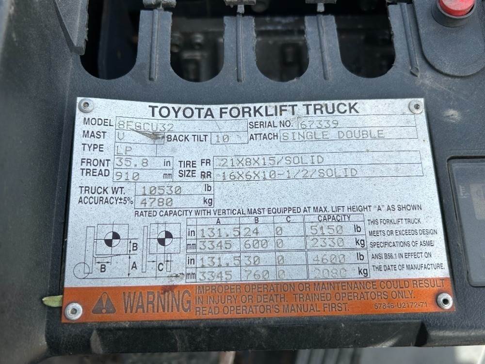 TOYOTA 8FGCU32 FORKLIFT, 6,500#, 80" mast, 2-stage, 131" lift, lpg, canopy, solid tires. s/n:67339