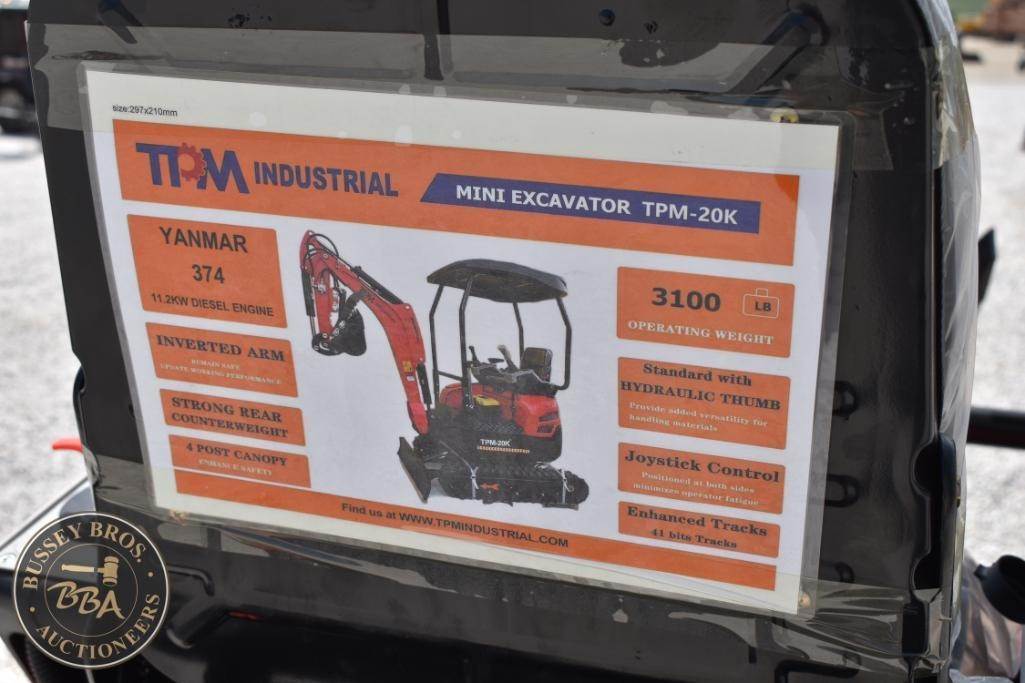 TPM 20K Mini Excavator, Yanmar diesel engine, rubber tracks hydraulic thumb, grading blade, estimated operating weight of 2,000 lbs (907 kg)...
