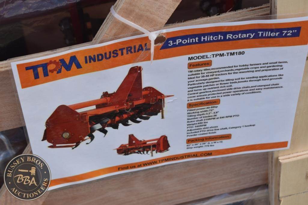 TPM Industrial TPM-TM180 Rotary Tiller, features a 72" working width, 3-Point Hitch, weighs 650 lbs (295 kg), requires 40-50 HP, operates at...