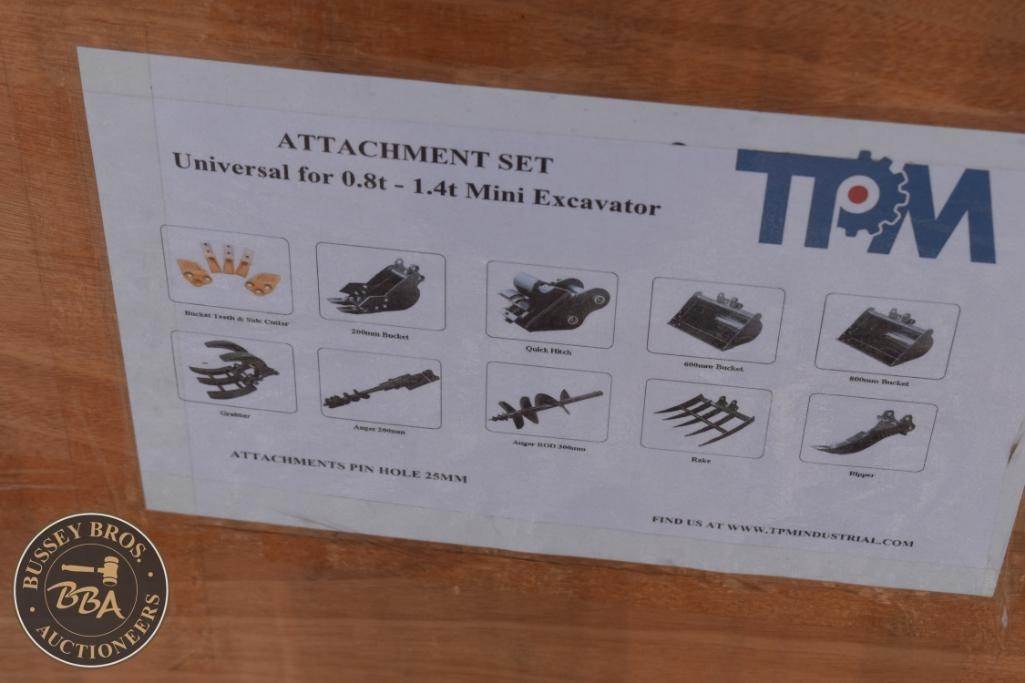 TPM Universal Attachment Set for 0.8t - 1.4t Mini Excavator, 25mm Pin Size, includes Rake, 3 Buckets, Quick Hitch, Auger, Ripper, rake and grabber NEW/UNUSED