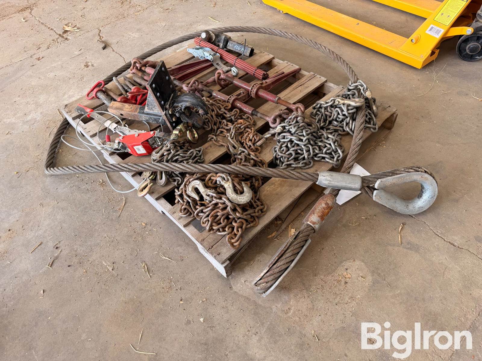 Trailer Chains & Towing Accessories, (5) 3/18" Chains, (3) 5/16" Chain, (1) Kock 2-Ton Hoist, (4) Chain Booms, Pin Hitches, 2-5/16" Ball Hitch, Ratchet Strap, Long Metal Threaded Tow Hook
