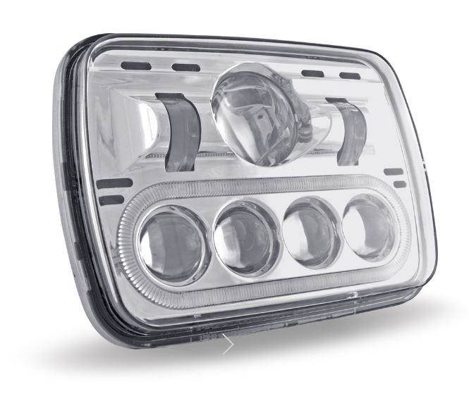 Premium Chrome LED Projector Headlight With White Auxiliary Angel Ring - 5 Inch x 7 Inch - High (890 Lumens)-Low (750 Lumens) - 7 Diodes