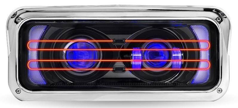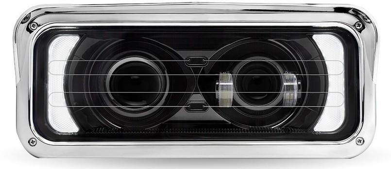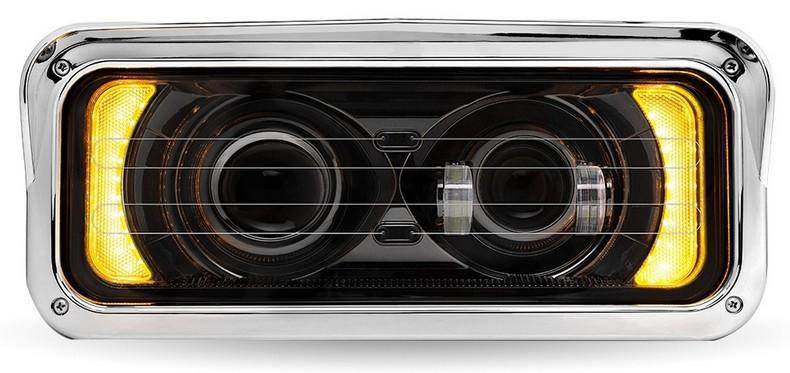 BLACK UNIVERSAL LED PROJECTOR HEADLIGHT ASSEMBLY WITH HEATED LENS, OPTIONAL BACKLIT AUXILIARY & HOUSING BUCKET - DRIVER SIDE REPLACES OEM 4 X 6 HEADLIGHT CONFIGURATION