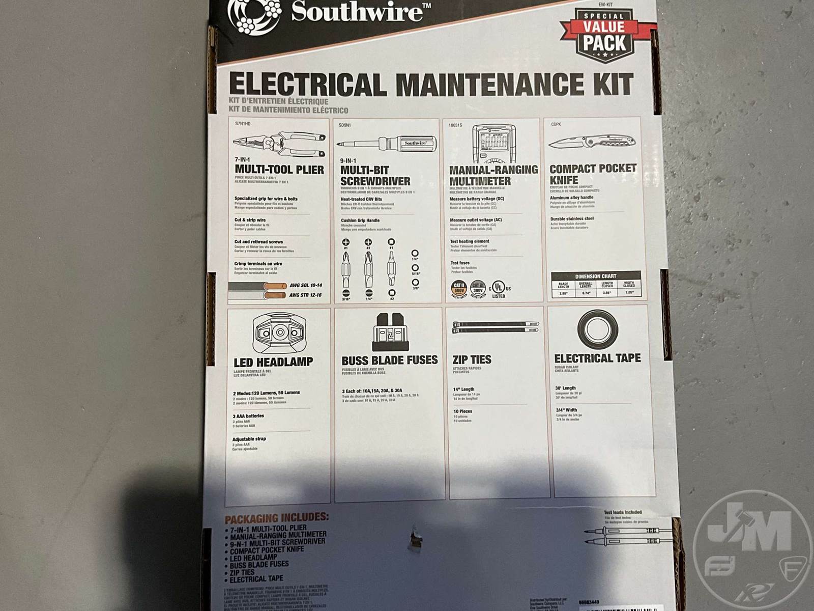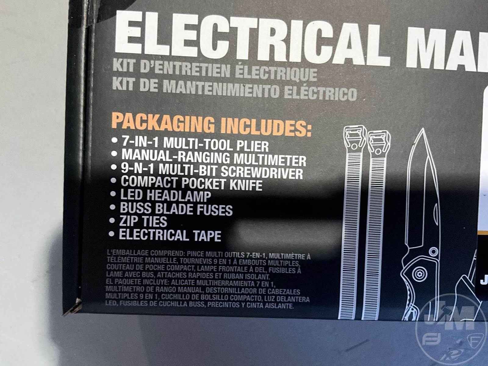 UNUSED ELECTRICAL MAINTENANCE KIT, TO INCLUDE 7 IN 1 MULTI-TOOL PLIER, MULTIMETER, 9 IN 1 MULTI BIT SCREW DRIVER, COMPACT POCKET KNIFE, BUSS BLADE FUSES, LED HEADLAMP, ZIP TIES, ELECTRICAL TAPE