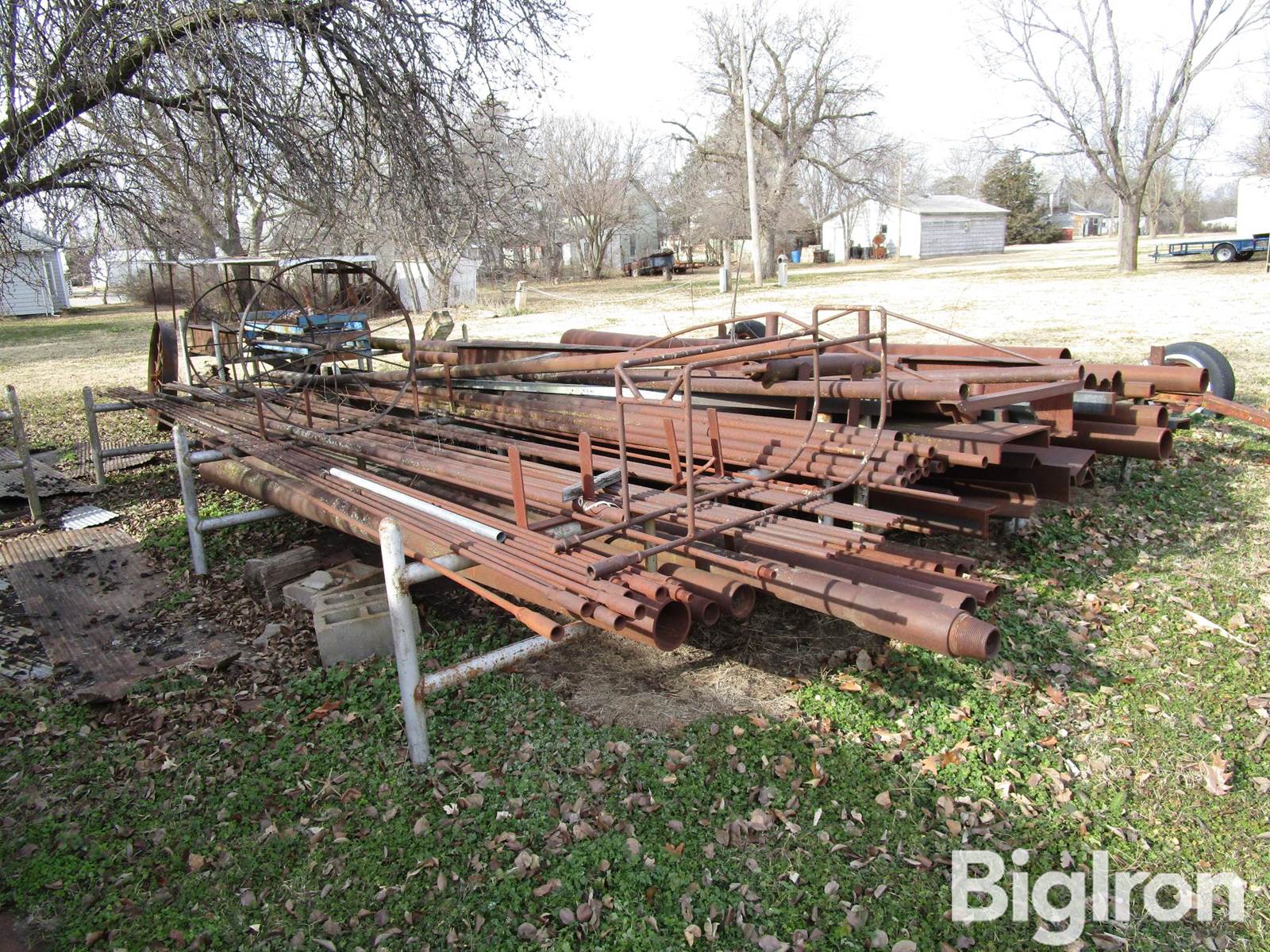 Unused Metal/Used Well Pipe Assortment & Running Gear, 8' Wide Axle on Spoke Wagon Wheels, Electric 2026 Running Gear w/15" Automotive Tires, Adjustable Length Tongue, Extendable Length, Angle Iron Pieces from 1/4" to 1", Channel Iron 1/4" to 1/2", I-Beam Lengths, 1/4"x4"x12", Pipe From 1.5" to 5.5" ID, (12) Lengths of Sucker Rod, (13) Sticks of 3/4" x 28' Metal Rod, 1/2"x 8" I-Beam, 1.5" x 4" x 15' Metal Length, 3/4"x8"x15' Metal Length, 1.25" x 5" x 10' Metal Length, 1" x 5" x 10' Metal Length, Many other Metal Pieces, NOTE: No Loading Assistance With This Lot