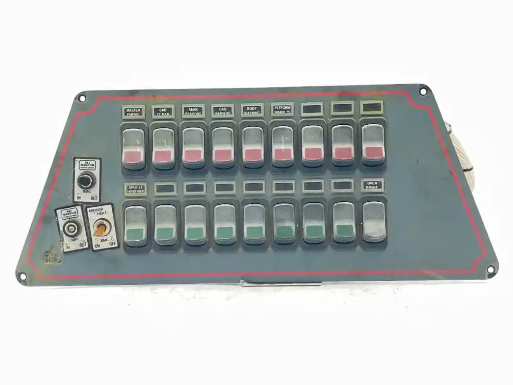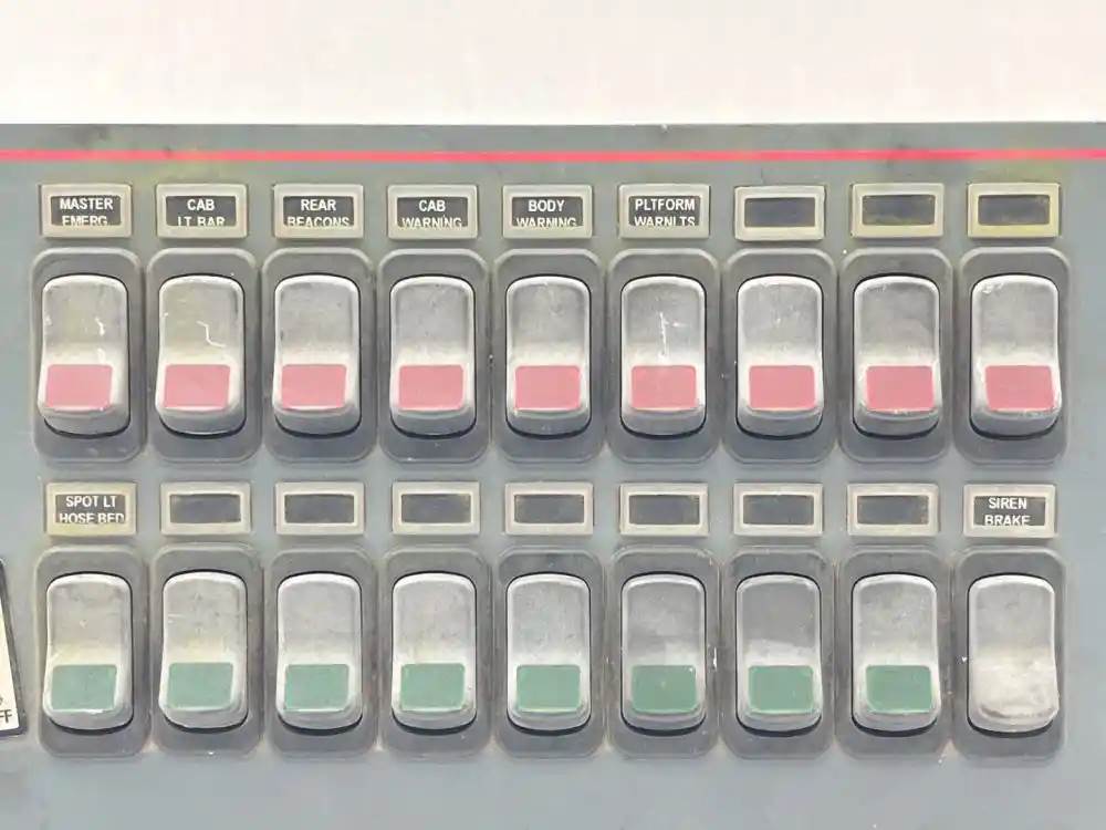 (Used) 2006 Sutphen Industrial 75’ Aerial Ladder, MISCELLANEOUS DASH SWITCHES- Controls: Mirror Control, Mirror Control, Mirror Heat, Master Emergency, Cab Light Bar, Rear Beacons, Cab Warning, Body Warning, Platform Warning Light, Spot Light Hose Bed, Siren Brake, Reference images for condition, For more informatioN about this item, give us a call. We ship Worldwide! (CRG HEAVY TRUCK PARTS) 929 W PULASKI HWY ELKTON, MD 21921
