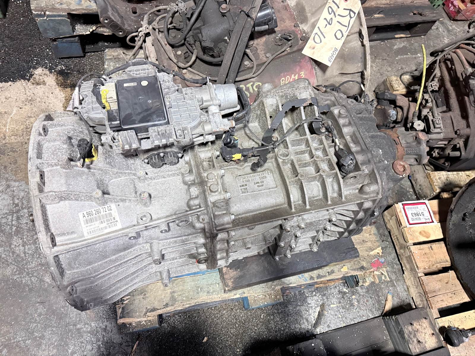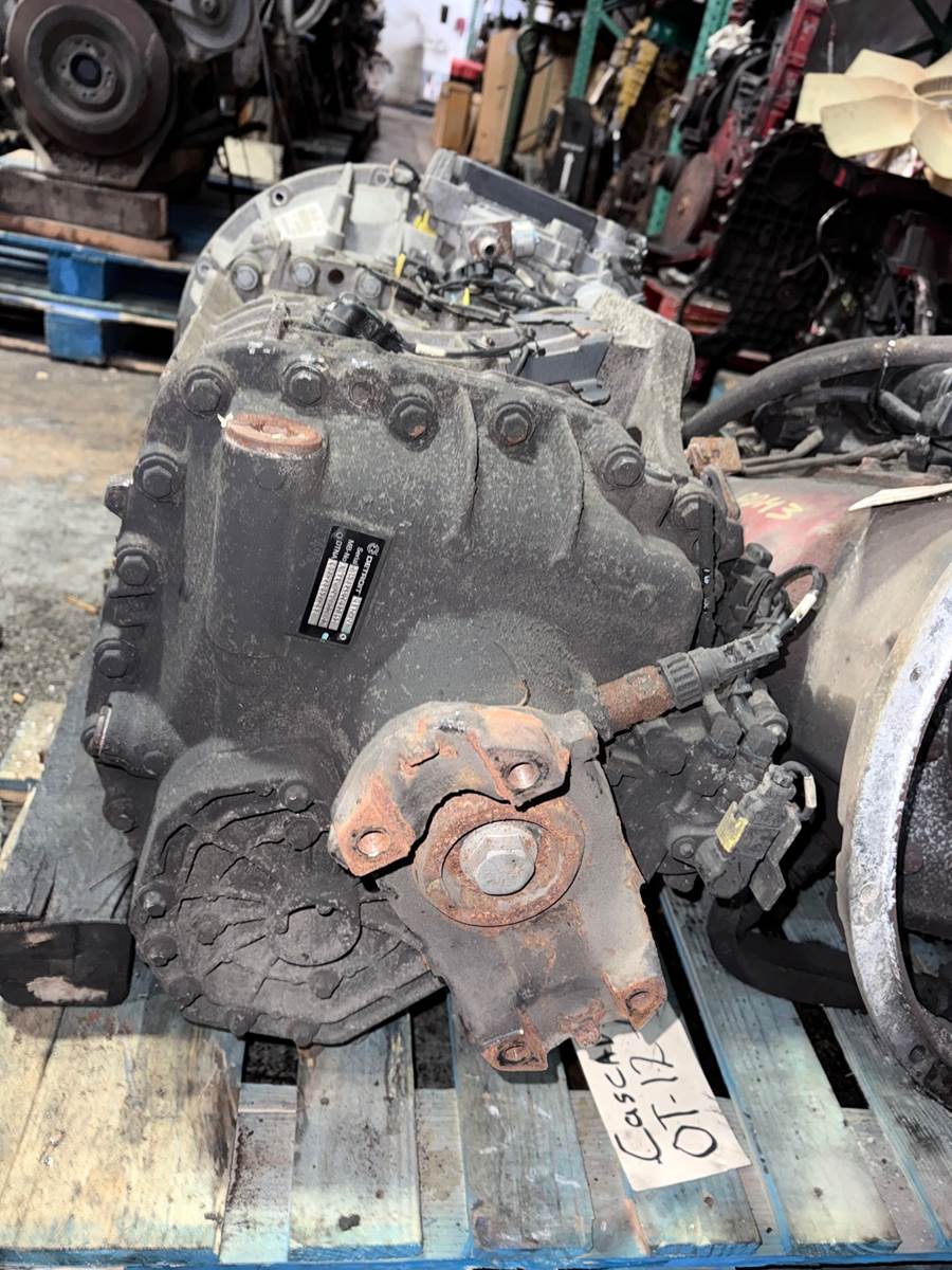 Heavy-duty Detroit DT12A-OD automated transmission removed from a running unit and inspected prior to sale. This transmission is commonly used in Freightliner Cascadia trucks and is designed for reliable heavy-duty performance.