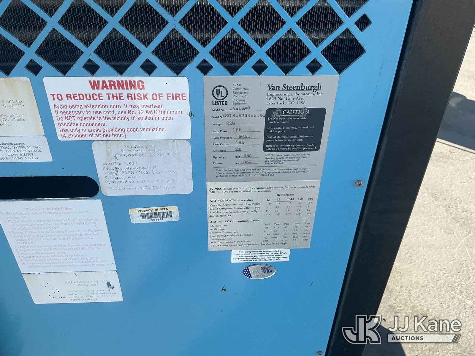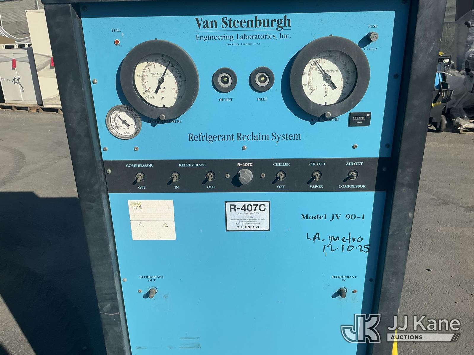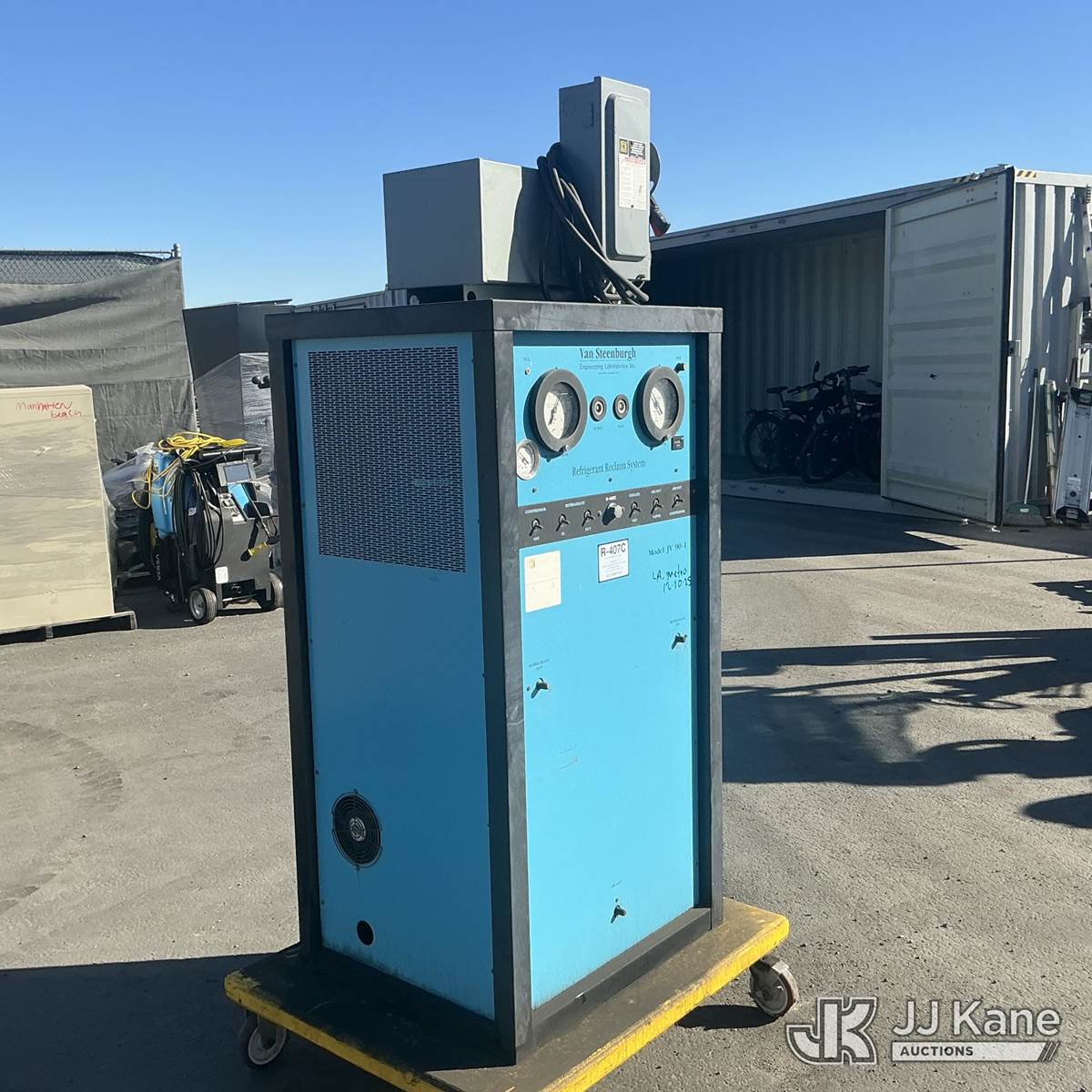 Van Steenburgh Refrigerant Reclaim System (Used) NOTE: This unit is being sold AS IS/WHERE IS via Timed Auction and is located in Jurupa Valley, CA. Inspection & preview days for this unit are the 2 business days prior to the first day of items closing for this auction, item is located at 4510 Muth Way Jurupa Valley, CA 92509 and hours of operations are 8a-4p. For pre-sale questions, please contact please contact Office Staff @ (310) 353-7140. Dealer License Number 45696. (Buyer is responsible for removal. Assistance by consignor or JJ Kane Auctions is not assured.)