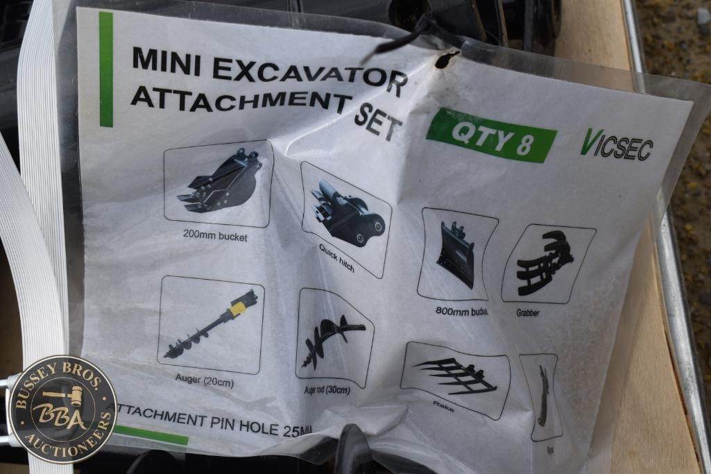 VICSEC Mini Excavator Attachment Set Includes buckets, quick hitch, grabber, augers, rake, NEW/UNUSED