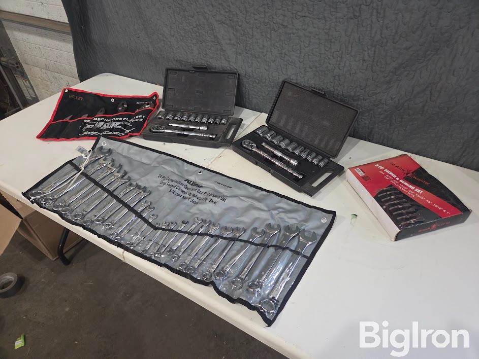 Viper / Black Widow / Allied / Valley Hand Tools, (1) Valley 5pc Mechanics Pilers Set, (1) Allied 24pc SAE/Metric Open And Box End Wrench Set, (1) Viper SAE 1/2" Drive 12pc Ratchet wrench Set, (1) Viper Metric 1/2" Drive 12pc Ratchet wrench Set, Black Widow 8pc Silver & Deming Set ( See Photos For Sizes)