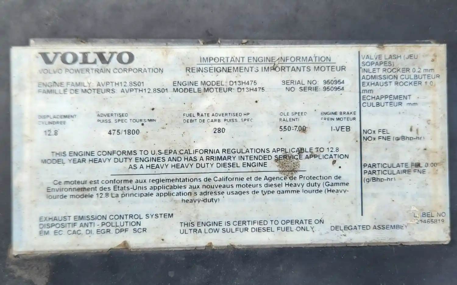 (Used) 2012 Volvo D13, ENGINE ASSEMBLY- Family Number: AVPTH12.8S01, Displacement: 12.8L, Horsepower: 475, Serial Number: 950954, Part Number: N-532381, E.C.S: EM, EC, CAC, DI, EGR, DPF, SCR, For more information about this item, give us a call. We ship Worldwide! (CRG HEAVY TRUCK PARTS) 929 W PULASKI HWY ELKTON, MD 21921, Serial#: 950954, Horse Power: 475, Casting#: 950954
