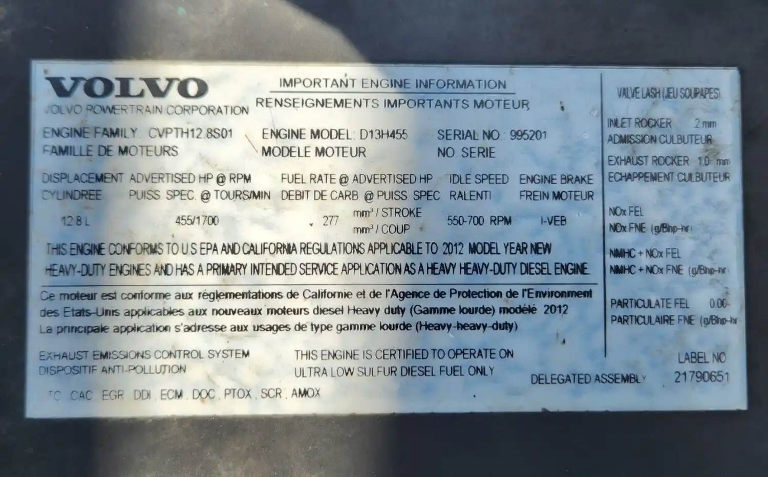 (Used) 2012 Volvo D13, ENGINE ASSEMBLY- Family Number: CVPTH12.8S01, Displacement: 12.8L, Horsepower: 455, Serial Number: 995201, Part Number: N-129647, E.C.S: TC, CAC, EGR, DDI, ECM, DOC, PTOX, SCR, AMOX, For more information about this item, give us a call. We ship Worldwide! (CRG HEAVY TRUCK PARTS) 929 W PULASKI HWY ELKTON, MD 21921, Serial#: 995201, Horse Power: 455, Casting#: 995201