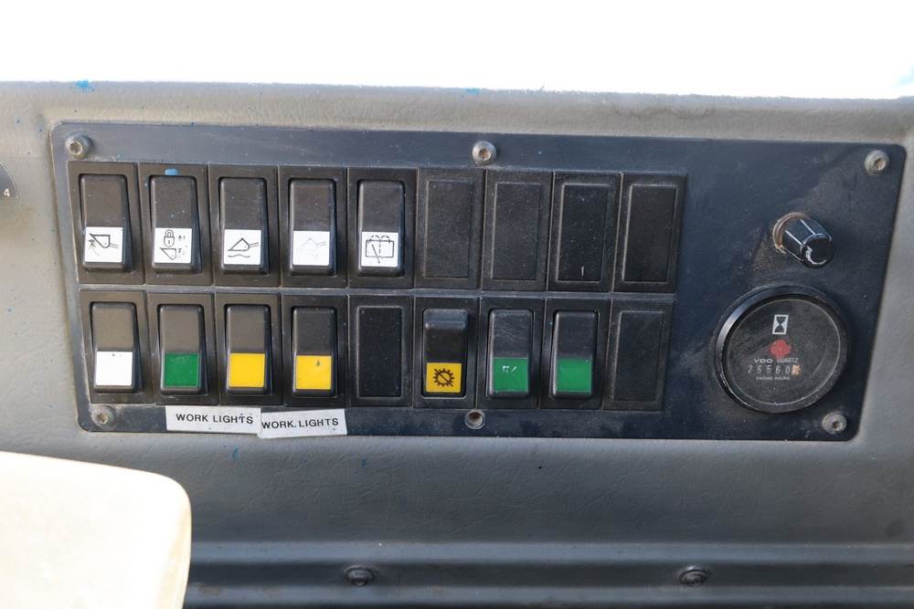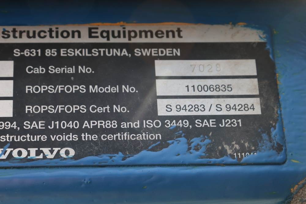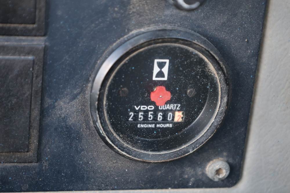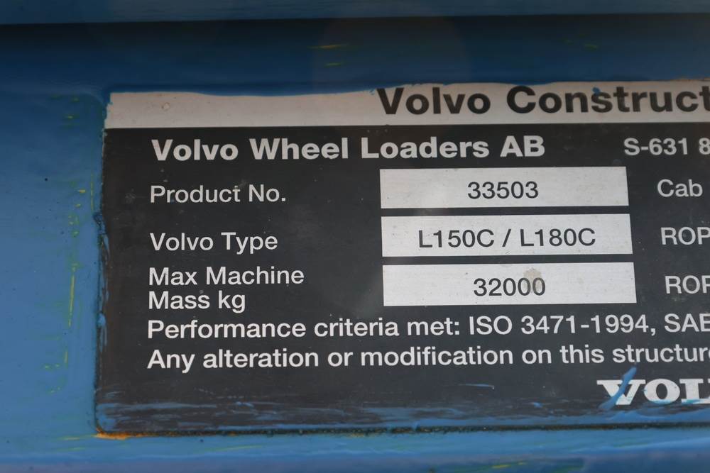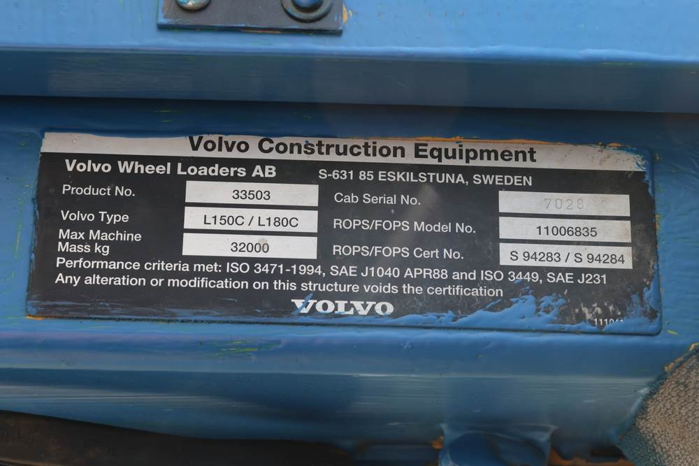 Volvo L150C/L180C wheel loader manufactured by Volvo Wheel Loaders AB, Eskilstuna, Sweden, product no. 33503, cab serial no. 7028. This heavy-duty front-end loader has a maximum machine mass of 32,000 kg and features a large general-purpose bucket. Equipped with an enclosed operator cab, articulated steering, and a VDO Quartz hour meter showing 25560 engine hours. Certified to ISO 3471-1994, SAE J1040 APR88, and ISO 3449, SAE J231 standards for ROPS/FOPS protection. Seller reports: Runs and operates as intended.