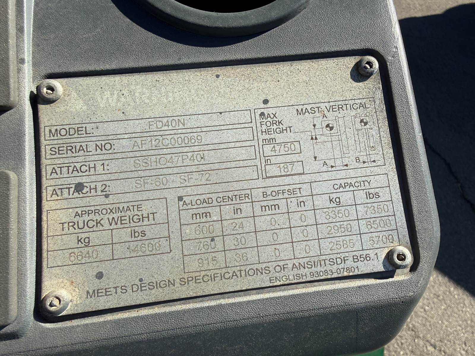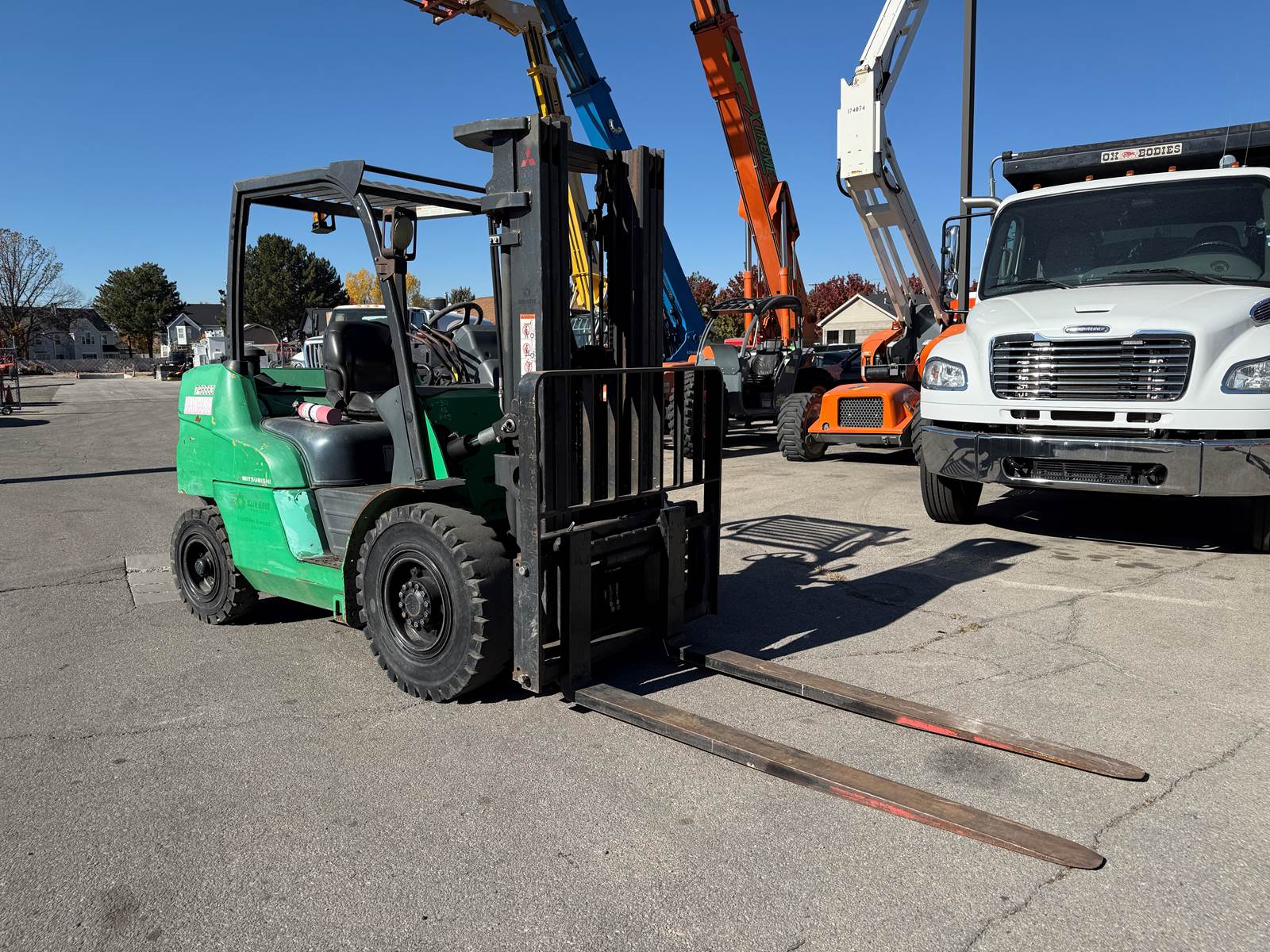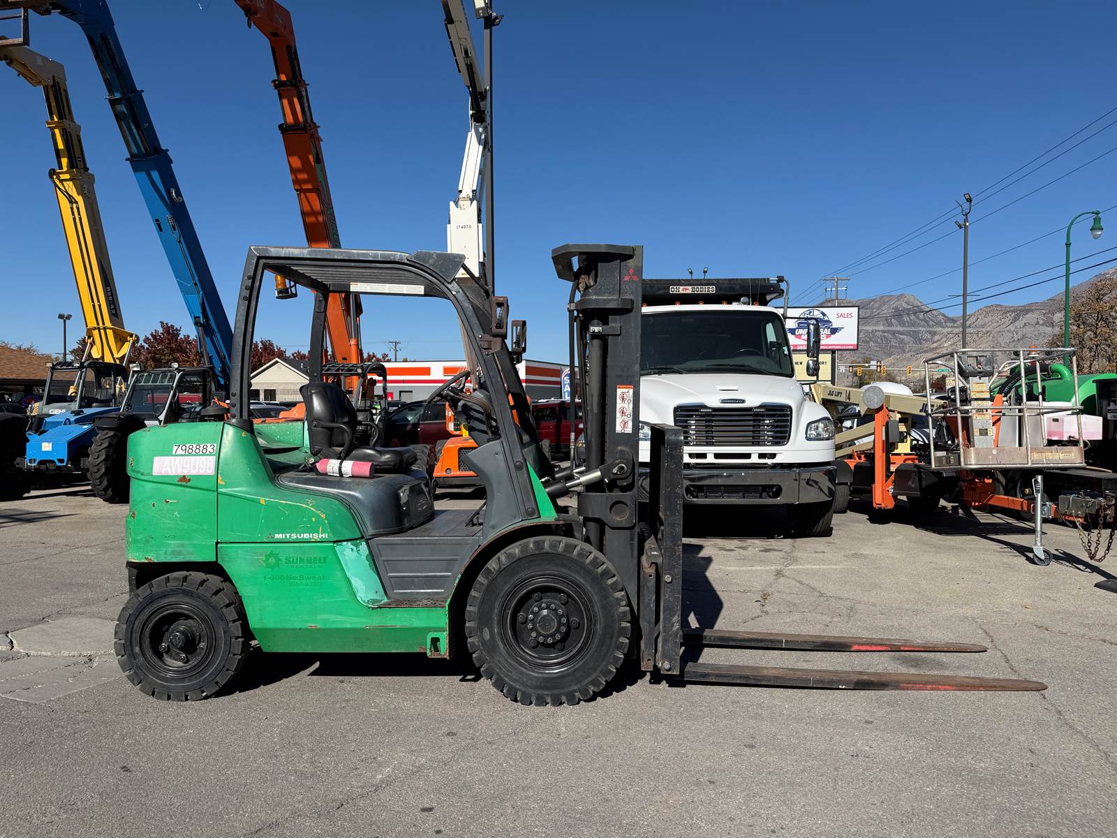 * 2015 Mitsubishi FD40N Forklift * Side Shift * 15’ 7” (187”) Lift Height * 8,000 LB Capacity * Perkins Diesel * 3 Stage * 84” Mast * SN: AF12C00069 * Hour Meter Reads: 2,822 EXTERIOR Paint: Good Body: Good Controls: Good. Operation normal Tires: Good condition. Traction Solid - Pneumatic Type F: 8.25-15 R: NEW 7.00-12 Wheels: Steel. Good condition Brakes: Good INTERIOR Seats: Good Dash: Good DRIVE Engine Type: Perkins 4 Cylinder Diesel Engine Condition: Good cold start, Good compression, Cylinder balance normal, Good power, No blowby Trans Type: Hydrostatic Trans Condition: Good. Operation normal Final Drives: Good Power Steering: Good. Operation normal Steering: Good Hydraulics: Good. All function and timing within specs Fluid Levels: Good DIMENSIONS W: 55" x H: 7' 7” x L: 10' 2" plus forks Forks: 72” x 5” Carriage Width: 47” Weight: 14,600 LB SUMMARY Great operation! Good on all sorts of terrain! My preference for forklift / tire combo coupled with a Perkins Diesel! What more could you ask for? INSPECTOR Robert Sorrells 801-473-6800 LOCATION: Orem, UT 84057 NEAR: Salt Lake City Area View all our inventory at www.GlobalRemarketing.net FINANCING We have financing options available. Please call Candi for information at 801-358-9635. SHIPPING ESTIMATES We have network of shipping brokers coast to coast allowing for the best shipping rates possible. We pride ourselves in getting quick quotes and for the lowest cost possible. For a more accurate detailed shipping price to your location, please call Candi at 801-358-9635