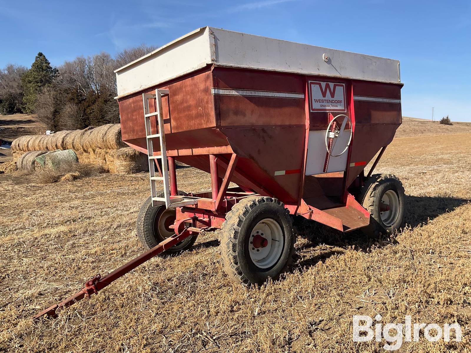 Westendorf 375 Gravity Wagon, Pin Hitch, Extendable Tongue, Westendorf Heavy Duty Running Gear, 8 Bolt Hubs, Front Access Ladder, Rear Hitch, 10.00-20 Truck Tires, Approximately 375 Bushel Capacity, NOTE: See Photos for Overall Condition, Item Must Be Removed by April 15, 2026 or Will Be Considered Abandoned