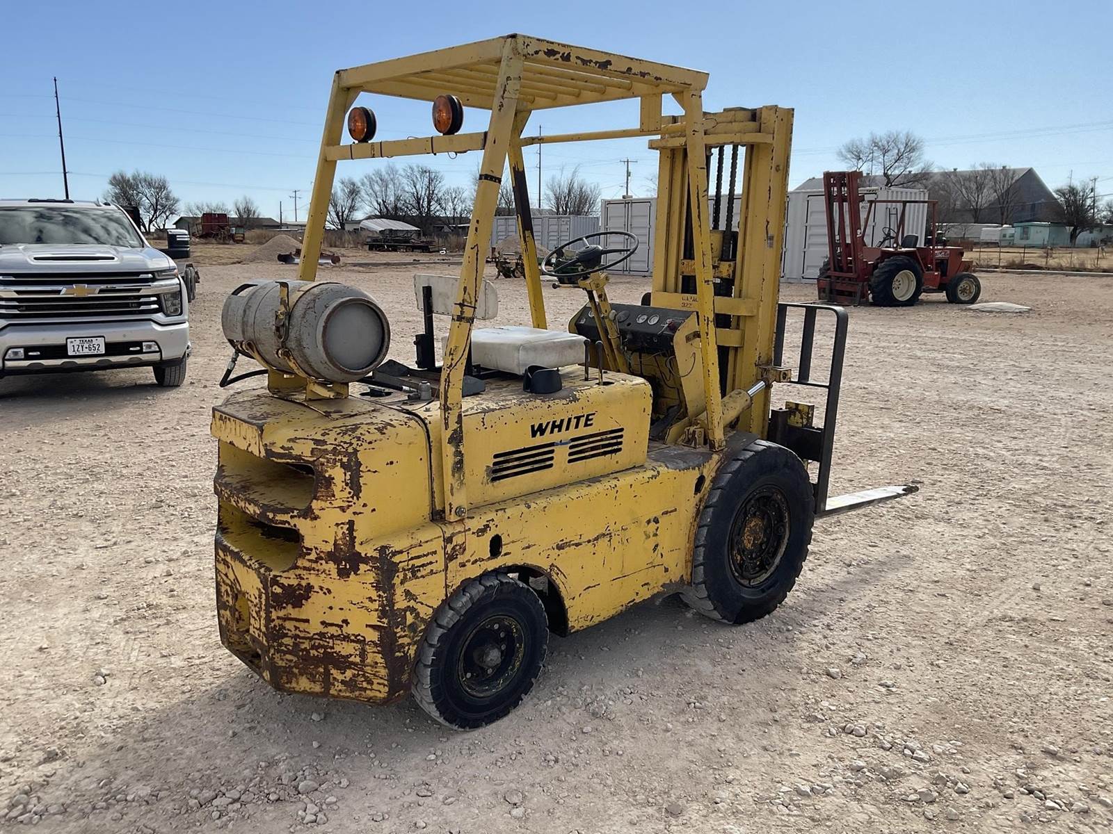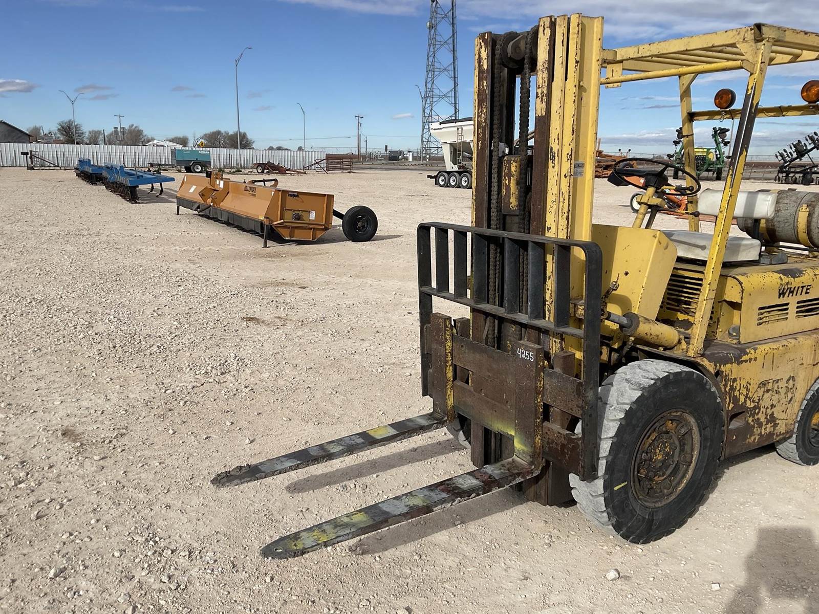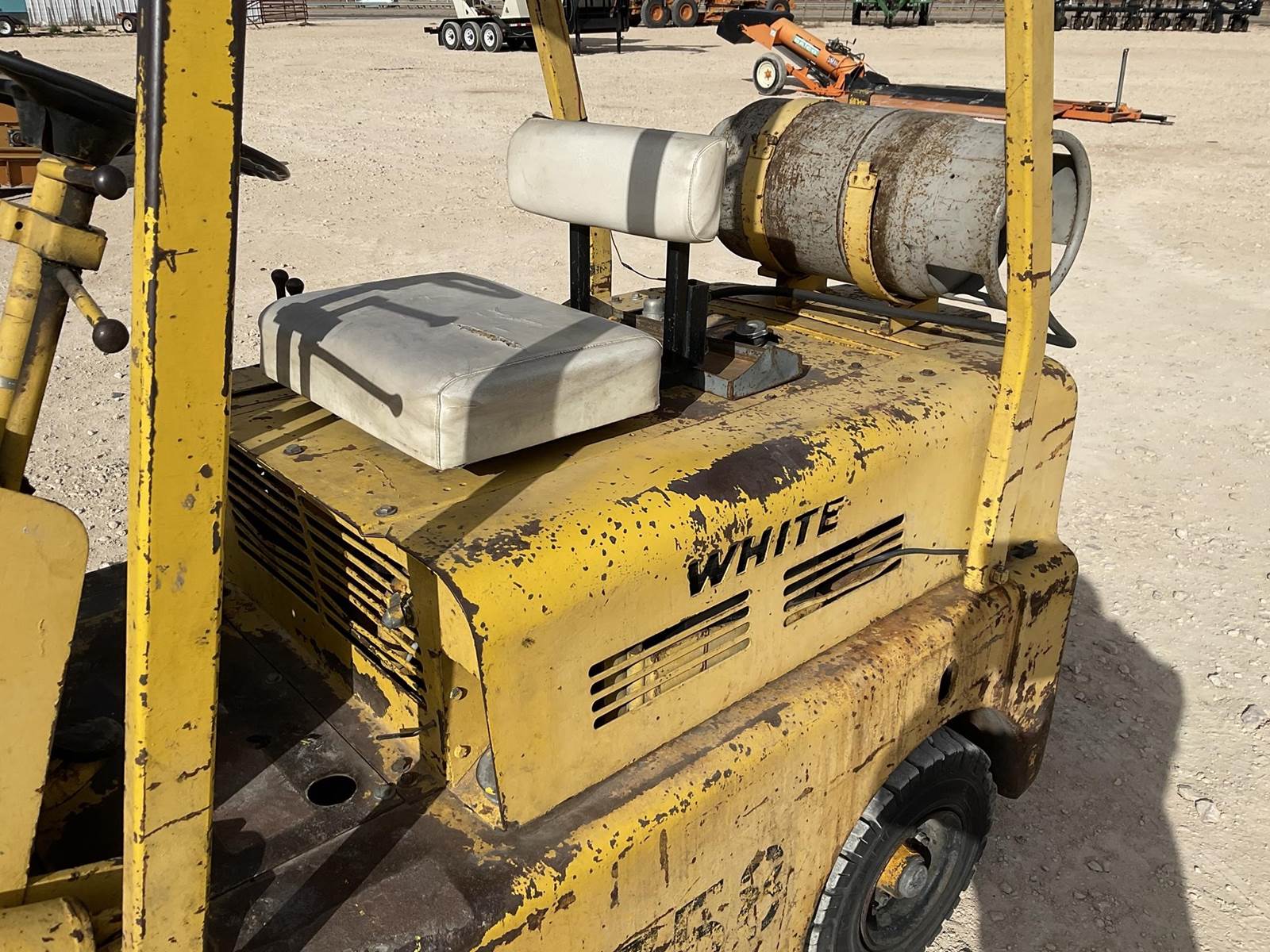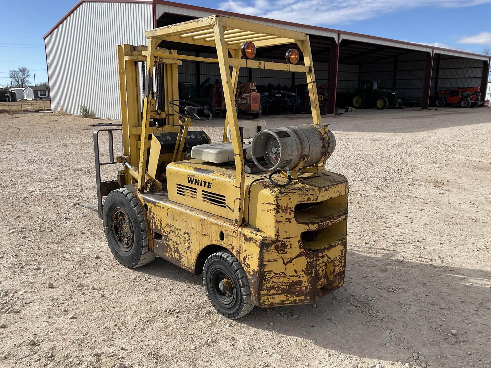 White MY50 LP forklift. Rated for 3225 lbs. Showing 4,883 hours. Fires right up. Runs like it should. Looks to be a good forklift!
