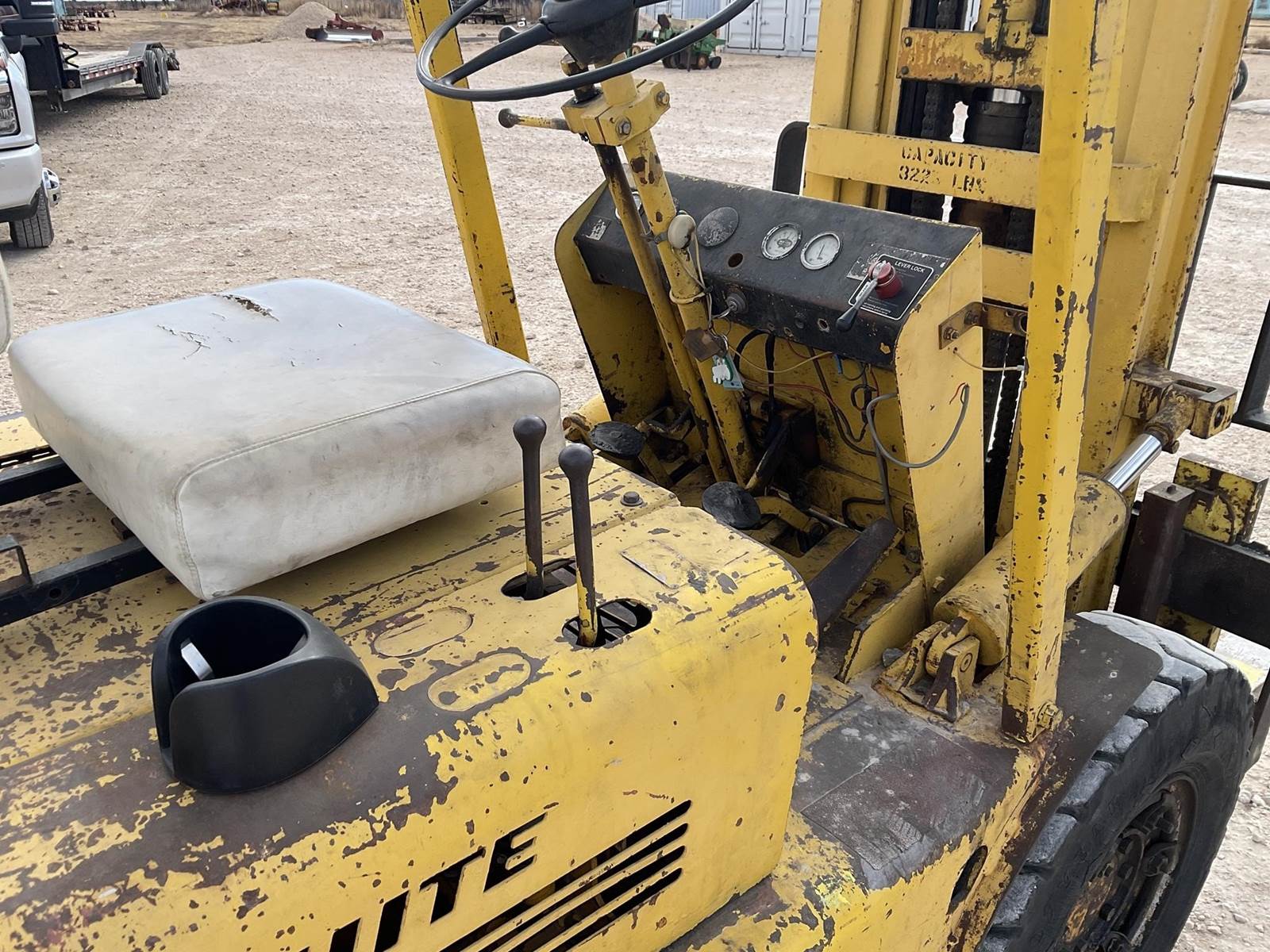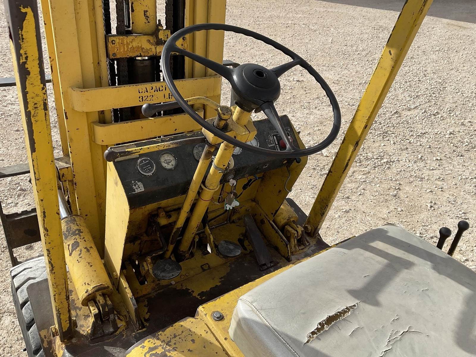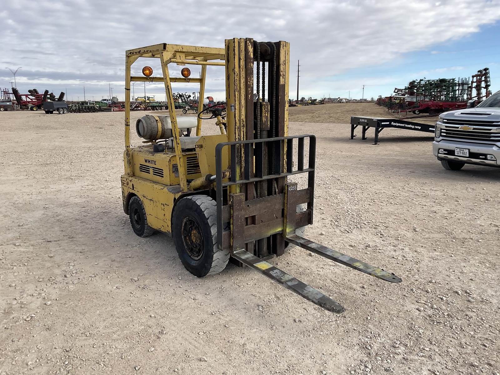 White MY50 LP forklift. Rated for 3225 lbs. Showing 4,883 hours. Fires right up. Runs like it should. Looks to be a good forklift!