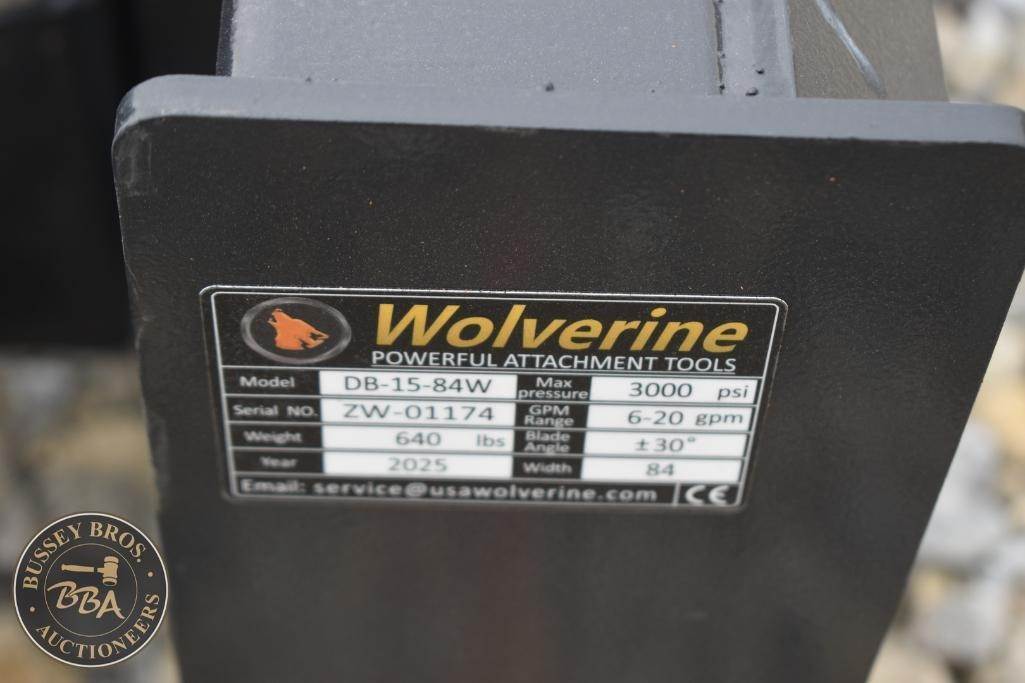 Wolverine 6 Way Dozer Blade Attachment Skid steer mount, power angle, and tilt, 84in working width, DB-15-84W, SN#ZW-01174, NEW/UNUSED