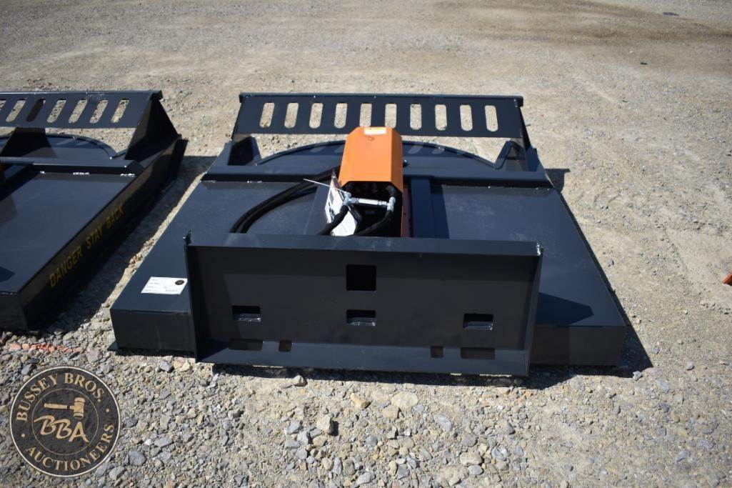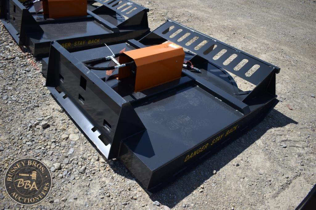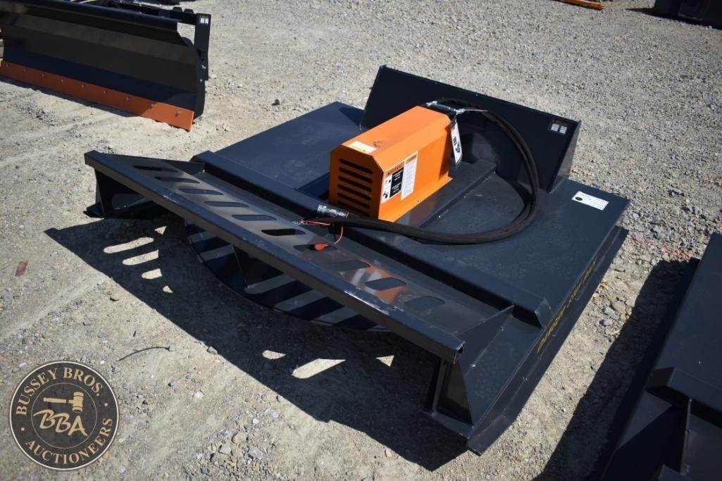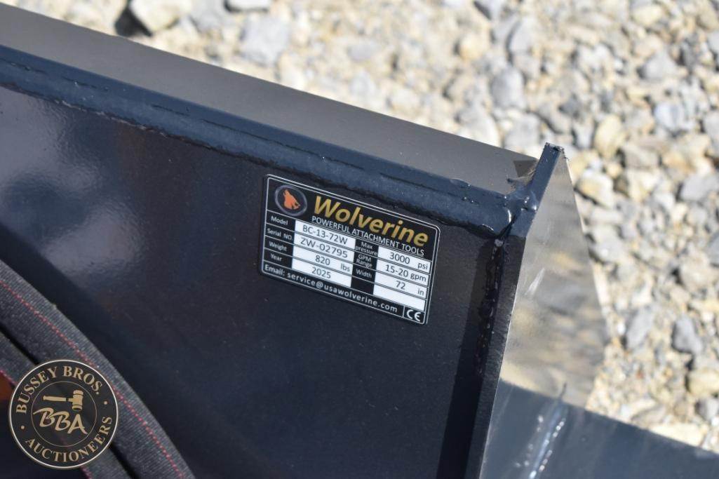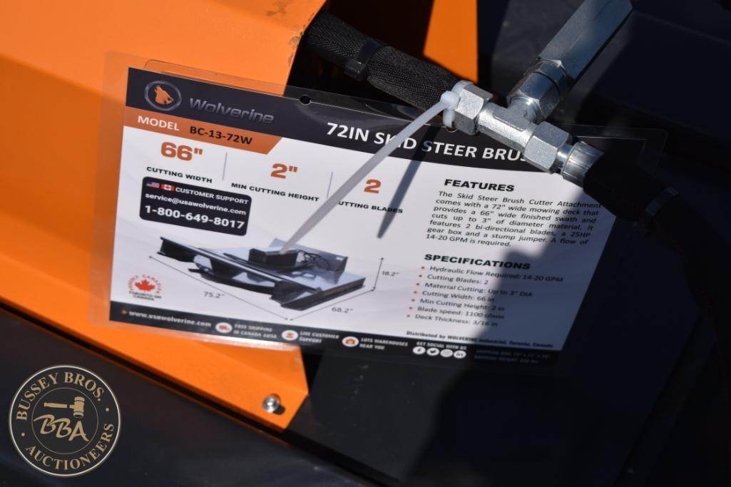 Wolverine BC-13-72W Skid Steer Brush Cutter, features include 72 inches cutting width, 15-26 GPM flow rate, 2-inch blade size, steel construction, hydraulic motor, includes safety instruction to add oil before use. Serial ZW02735.