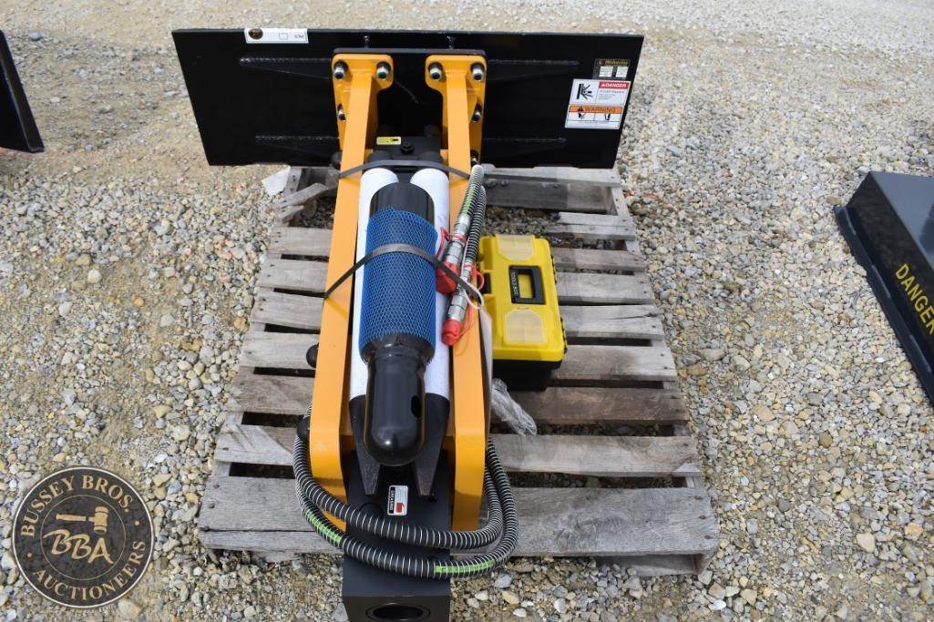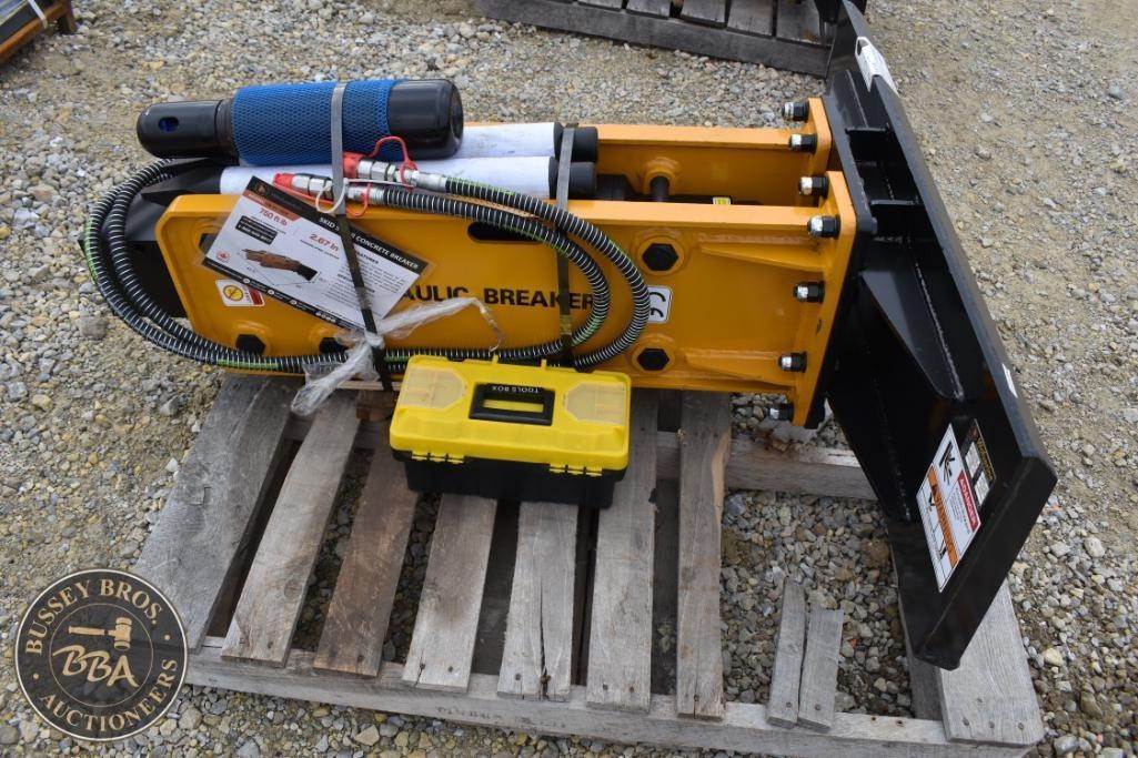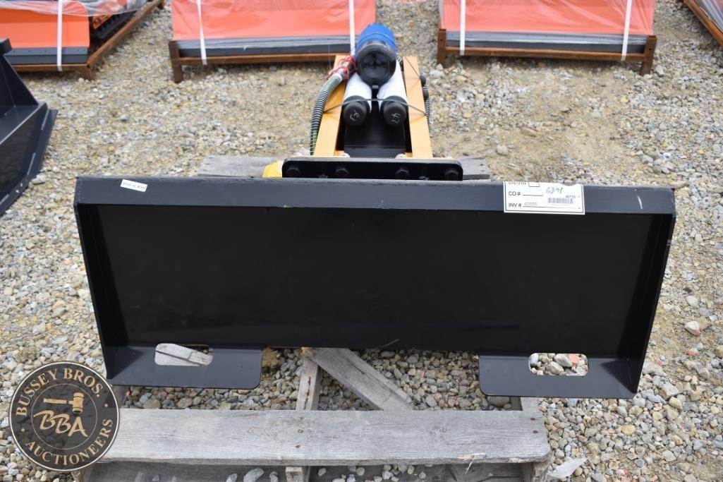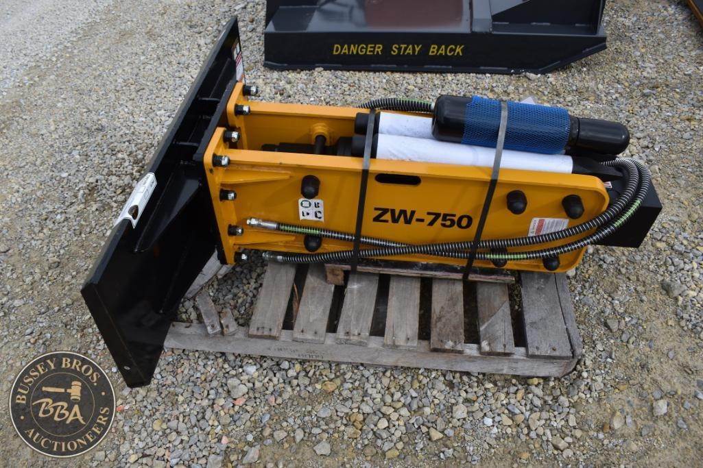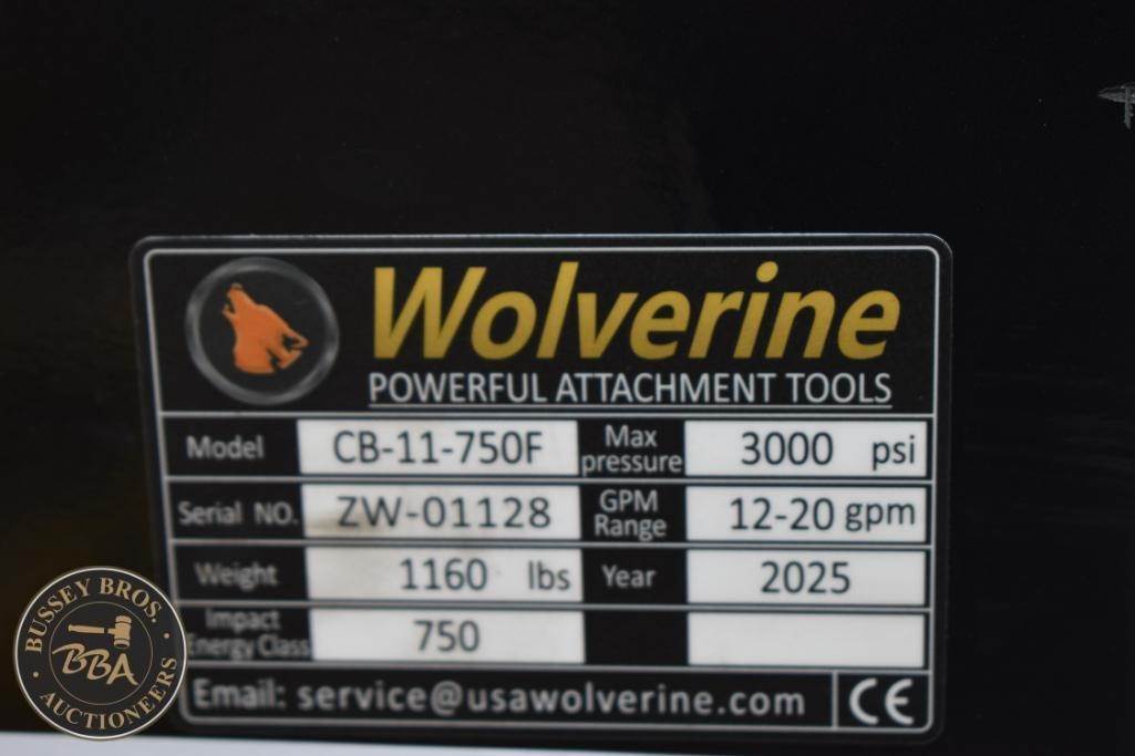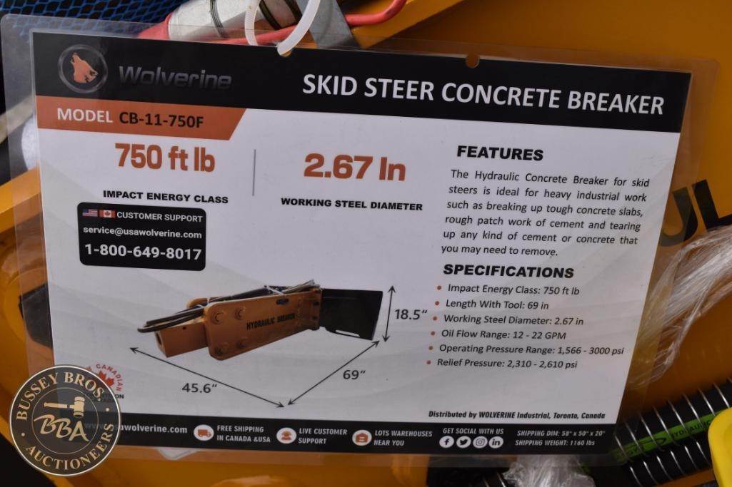 Wolverine CB-11-750F Skid Steer Concrete Breaker, featuring a max pressure of 3000 psi, GPM range of 12-20, weight of 1160 lbs (526 kg), impact power of 750 ft-lb, working steel diameter of 2.67 in (6.78 cm), operating pressure range of 1566-3000 psi, suitable for skid steers. Serial Number: ZW-01128.