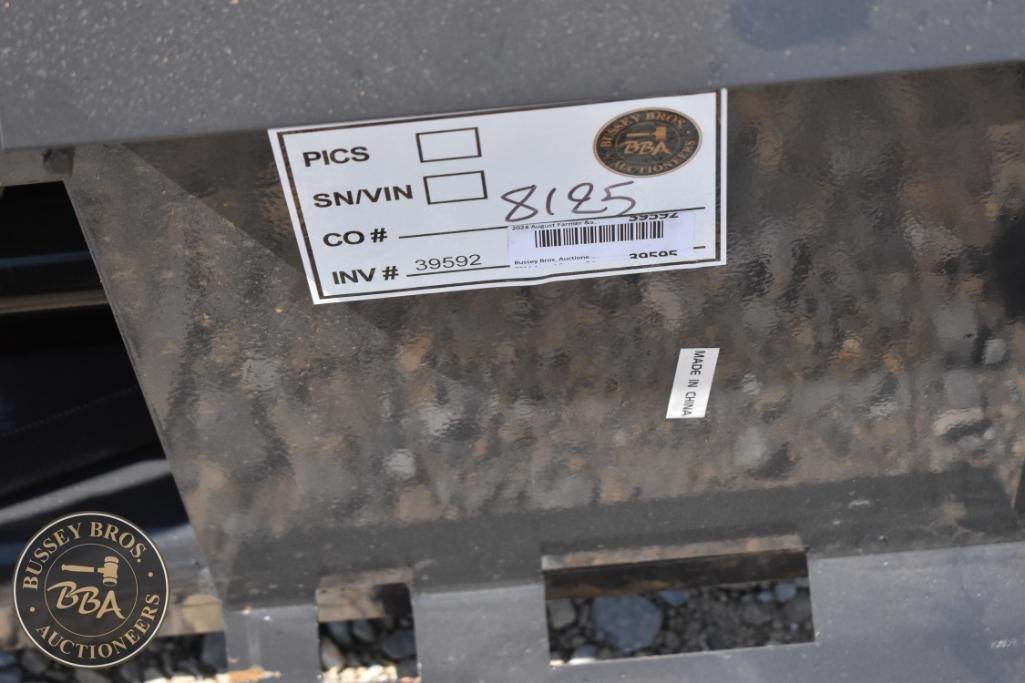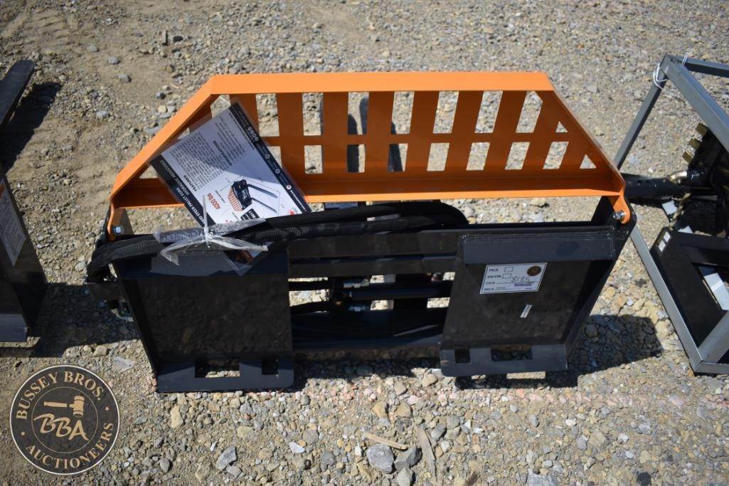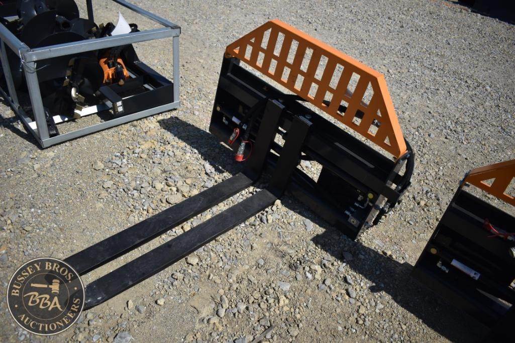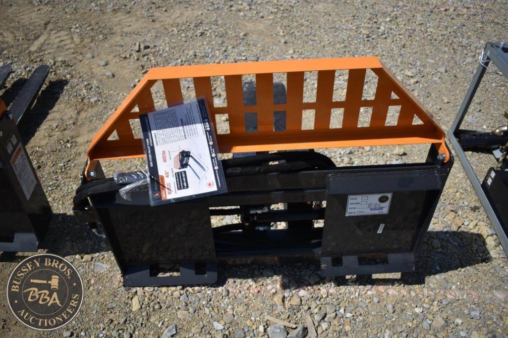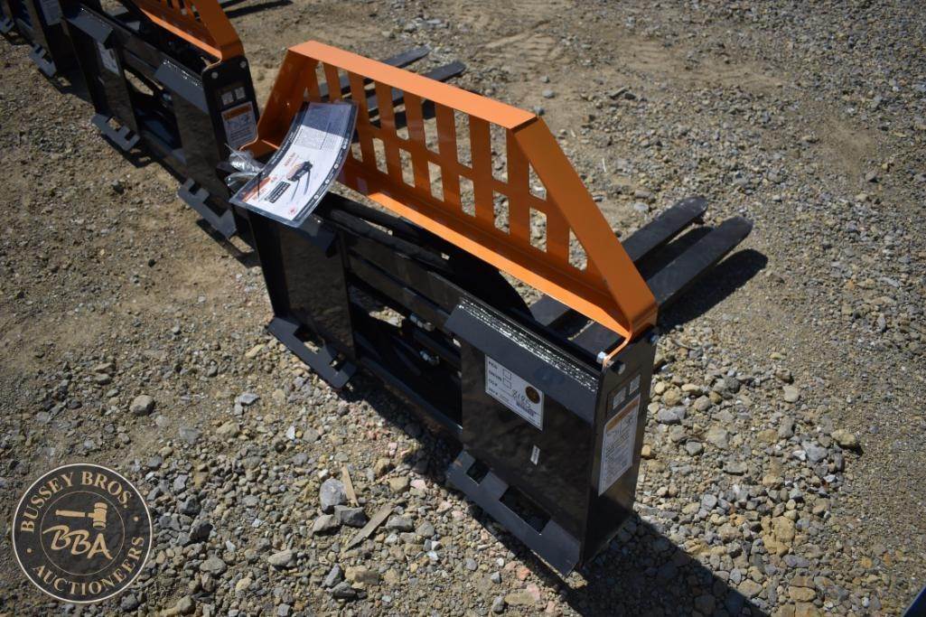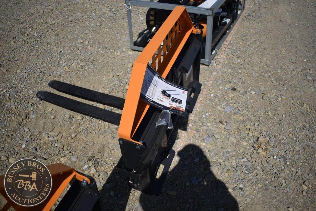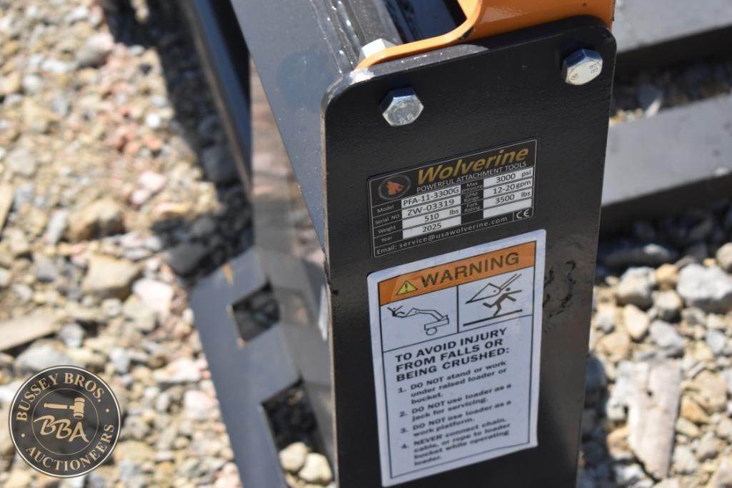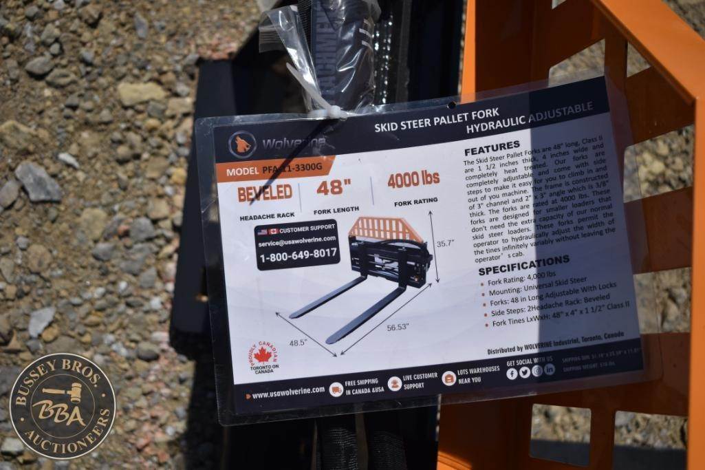 Wolverine FPA-13000G Skid Steer Hydraulic Pallet Fork, featuring a load capacity of 4000 lbs, 48" fork length, hydraulic adjustable, beveled edge, headache rack, made in China, Serial Number: 8125.