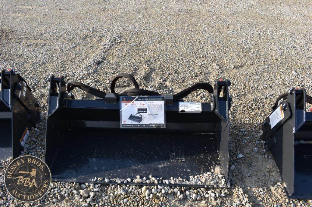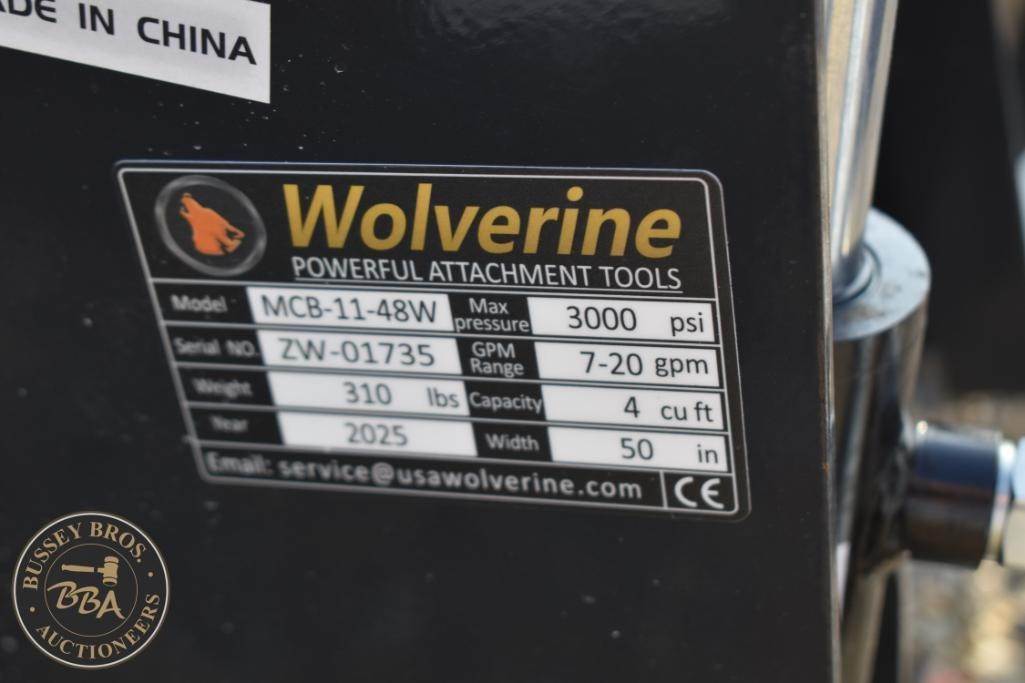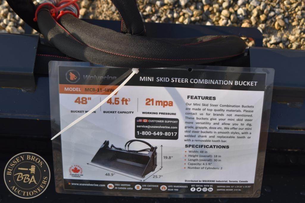 Wolverine MCB-11-48W Mini Skid Steer Combination Bucket, 48" bucket width, 4.5 cubic feet capacity, max pressure 3000 psi, GPM range 7-20, weight 500 lbs, dimensions 48.9 in x 19.5 in x 11.8 in, made in China, Serial Number: ZW-01735.