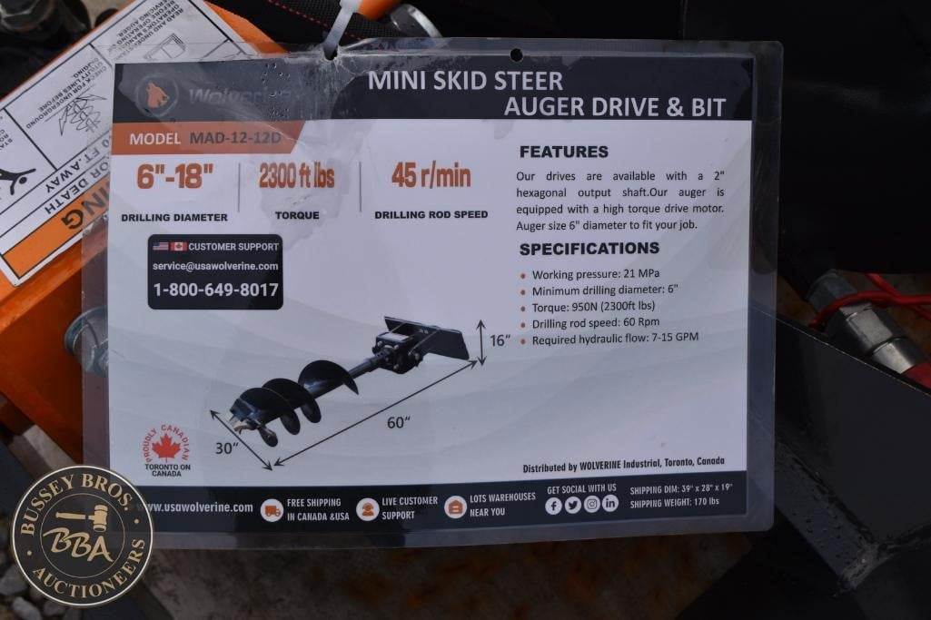 Wolverine Mini Auger Drive & Bit Attachment Mini Skid Steer Mount, Planetary gear, 2in hex output shaft, capable of driving up to 36in bit, SN#ZW-01960, NEW/UNUSED
