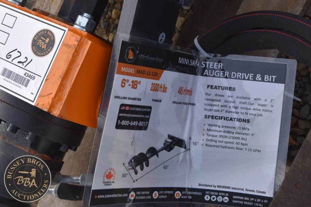 Wolverine Mini Auger Drive & Bit Attachment Mini Skid Steer Mount, Planetary gear, 2in hex output shaft, capable of driving up to 36in bit, NEW/UNUSED