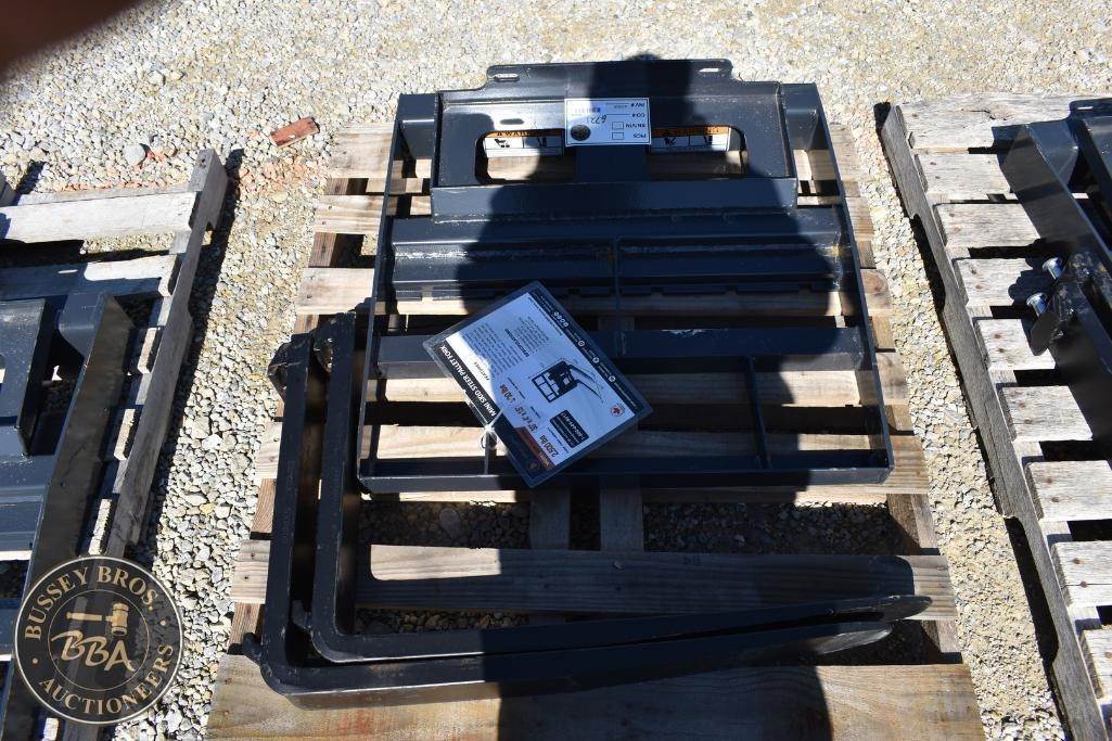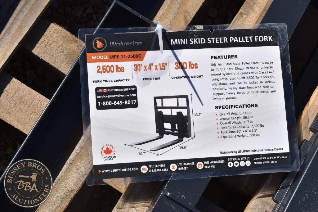 Wolverine Mini Pallet Fork Attachment Mini Skid Steer Mount, 30in x 4in x 1.5in, Class 1, 2,500lb fork rating, headache rack, NEW/UNUSED