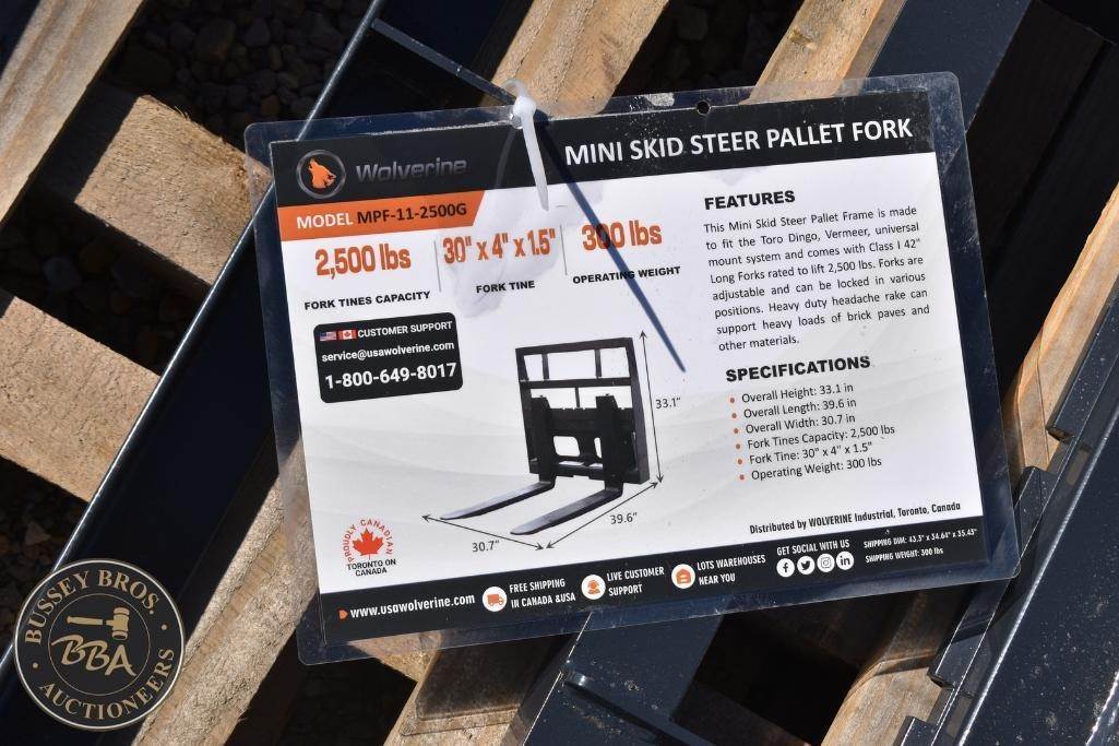 Wolverine Mini Pallet Fork Attachment Mini Skid Steer Mount, 30in x 4in x 1.5in, Class 1, 2,500lb fork rating, headache rack, NEW/UNUSED