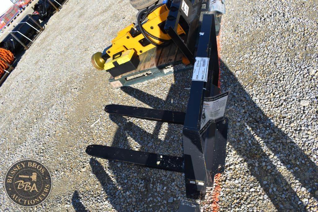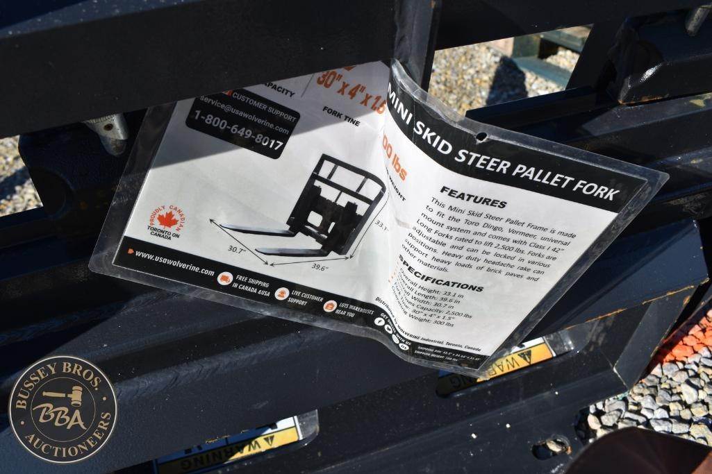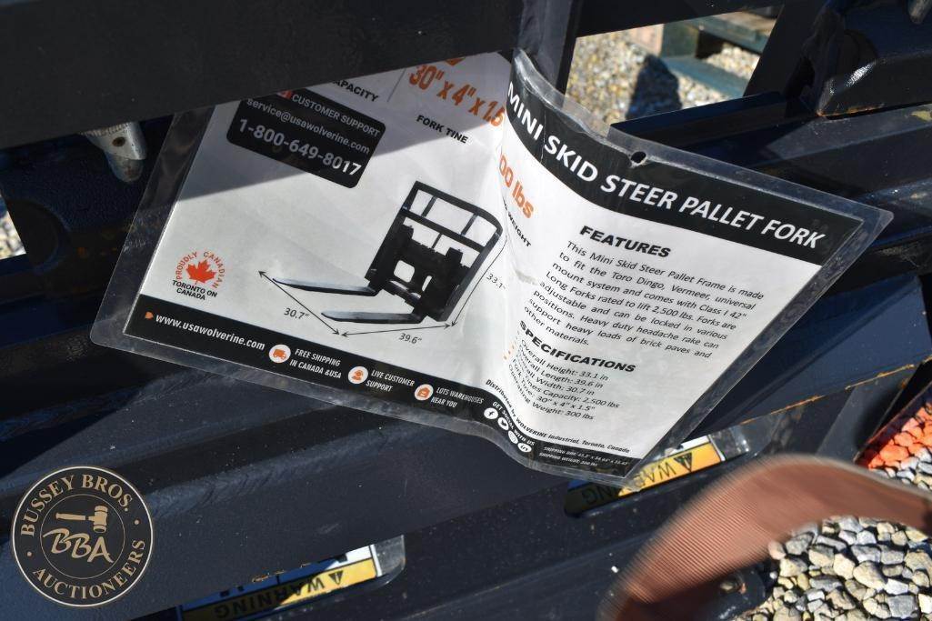 Wolverine MINI Pallet Fork Attachment MINI Skid Steer Mount, manually adjustable forks, brick guard, NEW/UNUSED