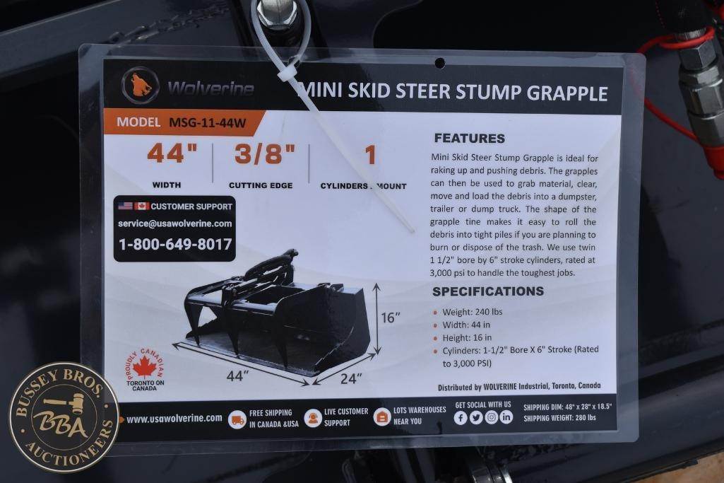 Wolverine Mini Stump Grapple Bucket Mini Skid Steer Mount, 44in, 2in tine spacing, SN#ZW-02015, NEW/UNUSED