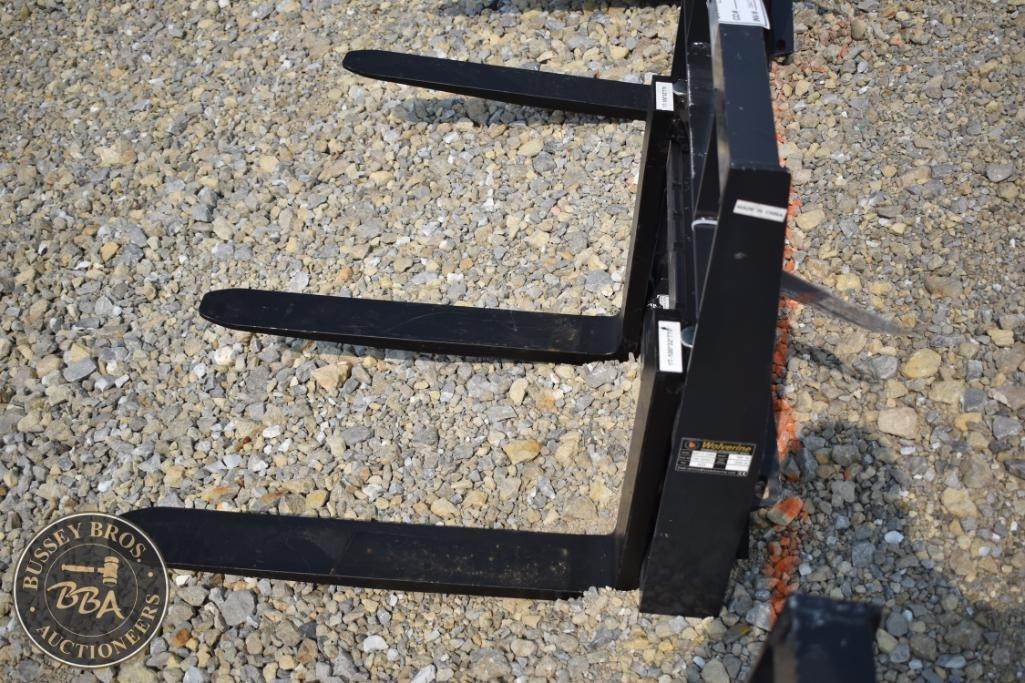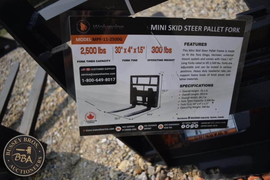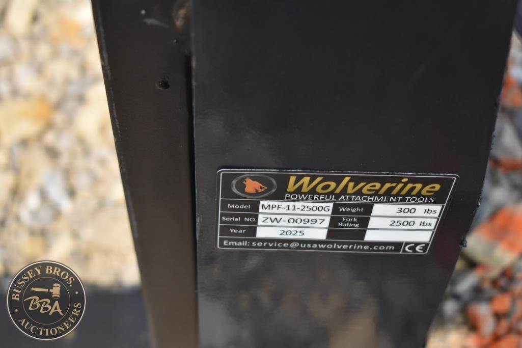 Wolverine MPF-11-2500G Mini Skid Steer Pallet Fork, 2,500 lbs fork capacity, 300 lbs weight, fork size 30" x 4" x 1.5", includes a 30" wide carriage, universal quick attach, heavy-duty frame, Serial Number: ZVW-00997.