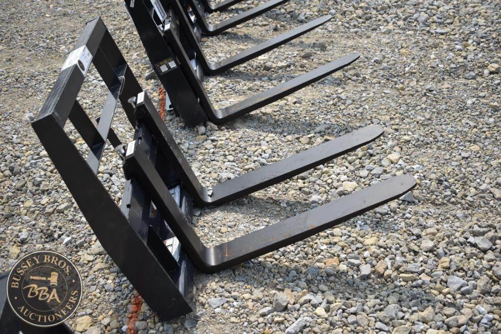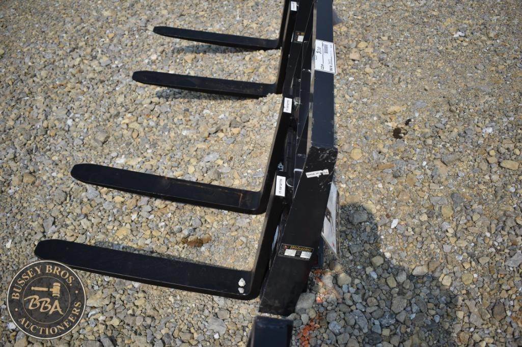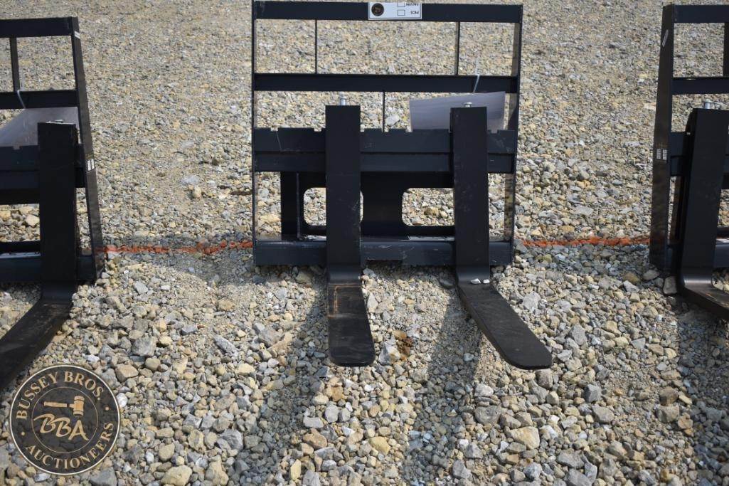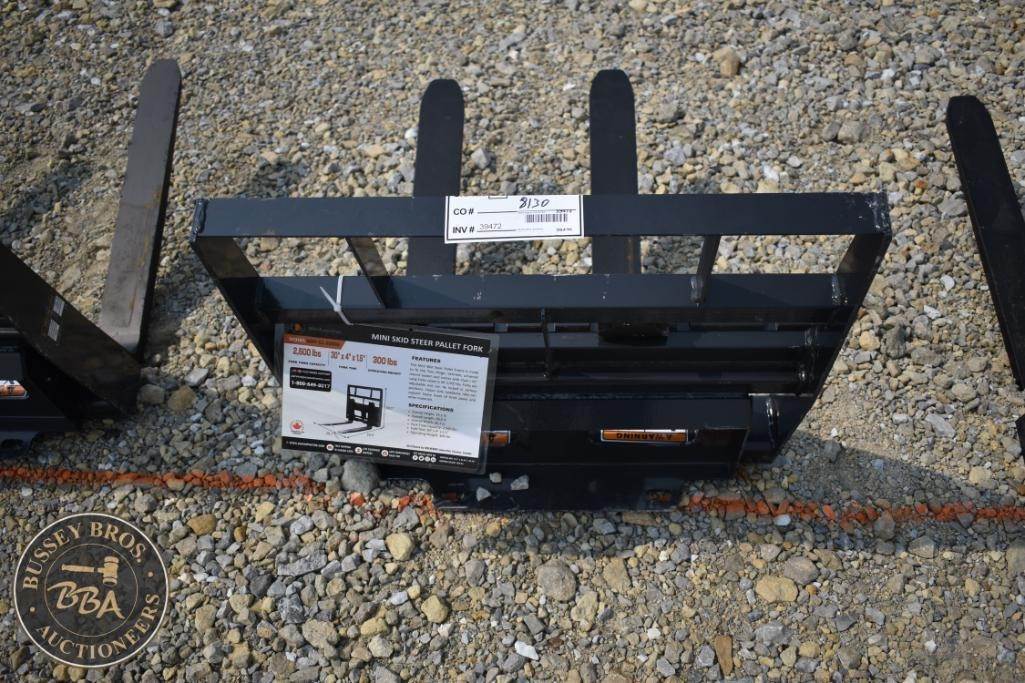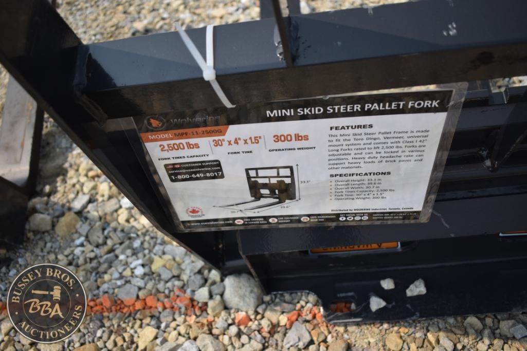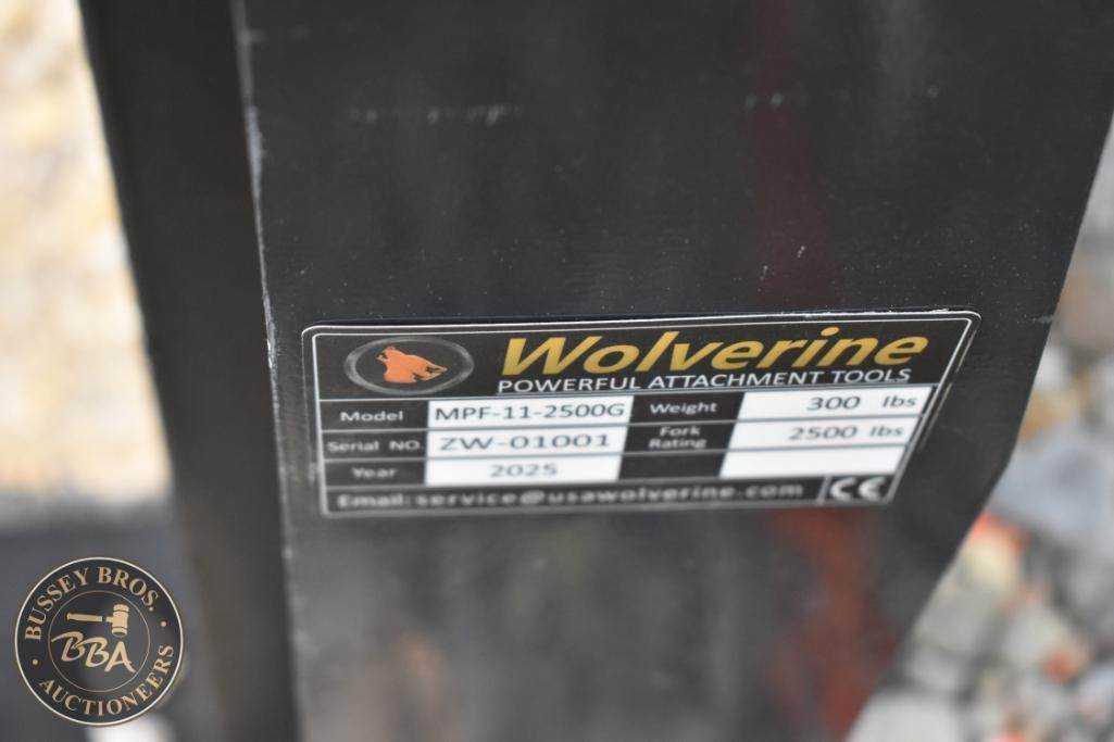 Wolverine MPF-11-2500G Mini Skid Steer Pallet Fork, 2,500 lbs capacity, fork dimensions 30" x 4" x 1.5", weight 300 lbs, compatible with mini skid steer loaders, steel construction, powder-coated finish for durability, Serial Number ZW-01001.