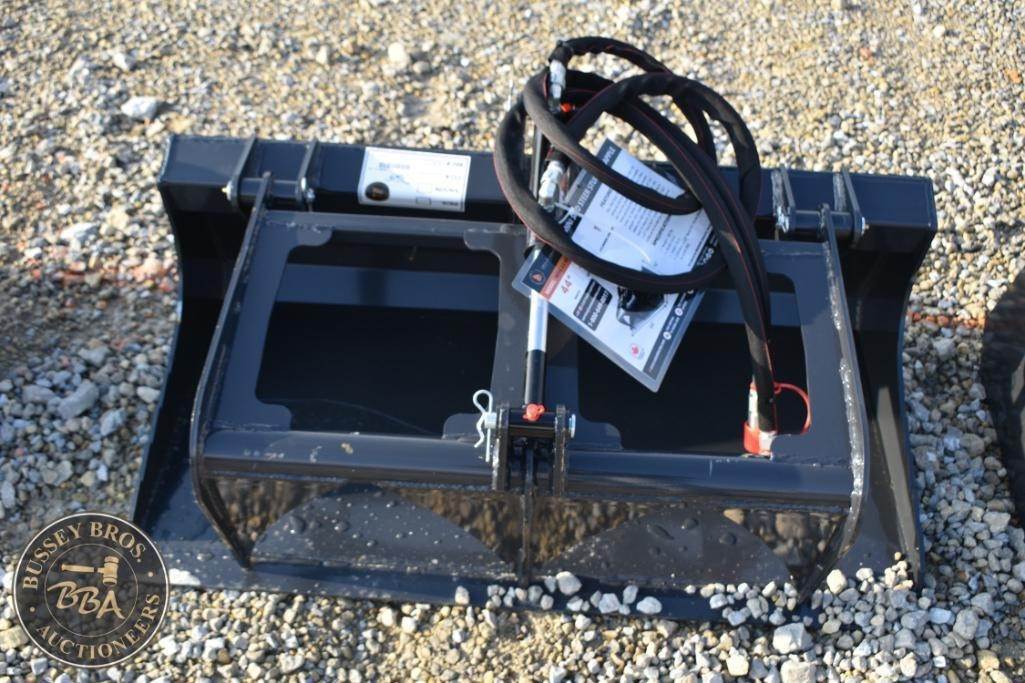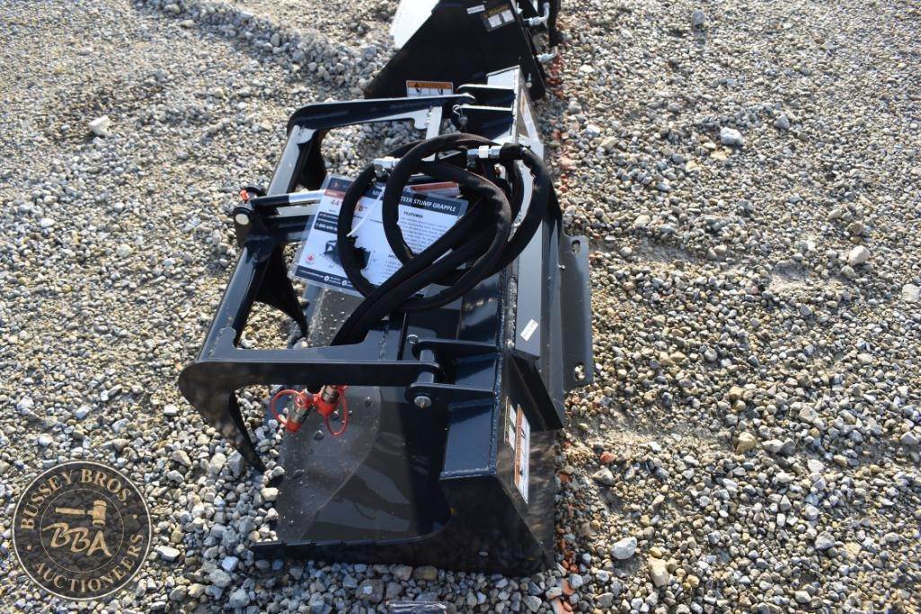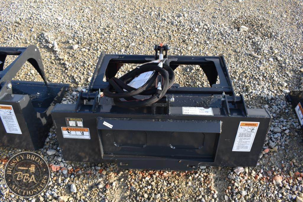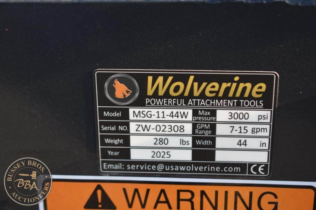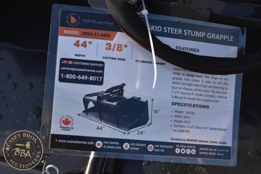 Wolverine MSG-11-44W Skid Steer Stump Grapple, 44" cutting width, 280 lbs weight, 3000 psi max pressure, 7-15 gpm hydraulic flow, 3/8" cutting edge thickness, 1 1/2" bore x 6" stroke cylinder, Serial Number: ZW-02308.