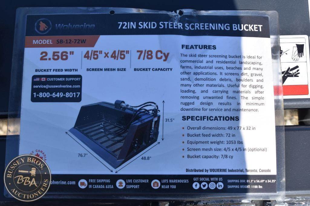 Wolverine Screen Bucket Attachment Skid Steer Mount, 72in overal width, 7/8cy bucket capacity, SN#ZW-00761, NEW/UNUSED,