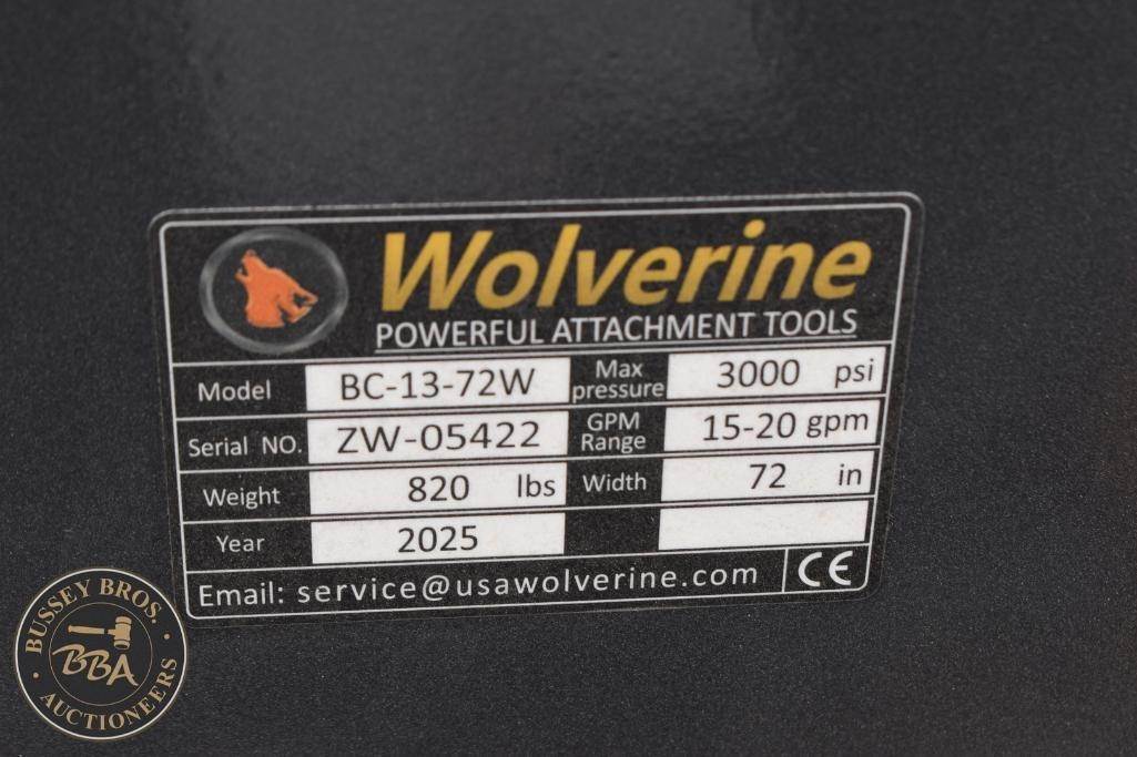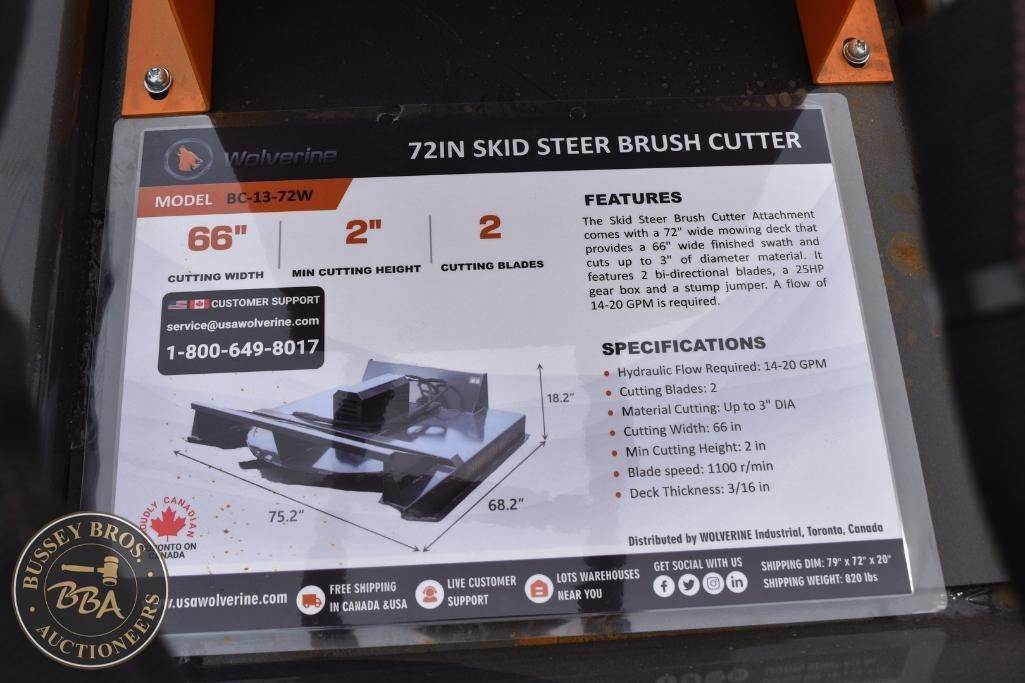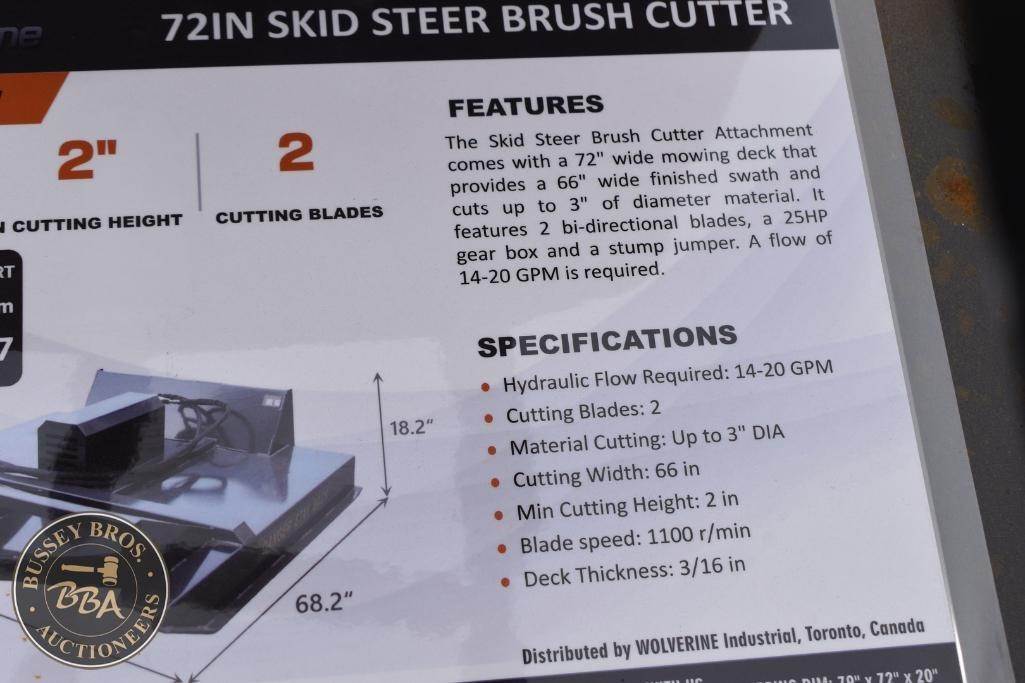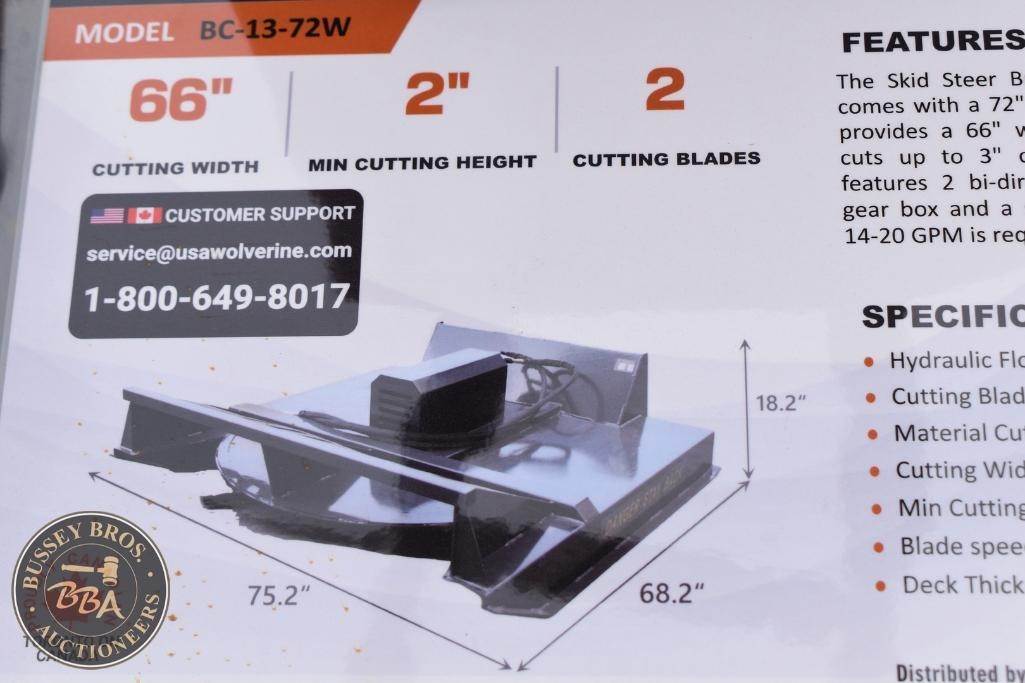 Wolverine Skid Steer Brush Cutter Attachment Skid Steer Mount, brush cutter, hydraulic, 66in cutting width, 2in min cutting height, 2 cutting blades, BC-13-72W, SN#ZW-05422, NEW/UNUSED
