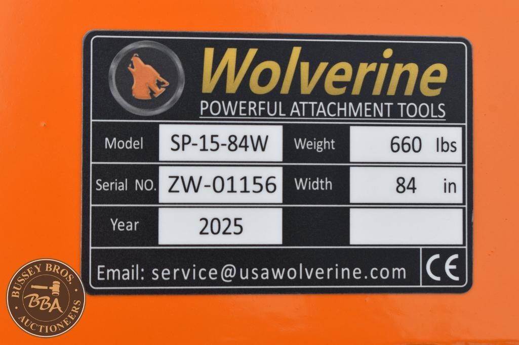 Wolverine Skid Steer Snow Pusher Attachment Skid Steer Mount, snow pusher, 84in width, 38in depth, 36in side panel, SP-15-84W, SN#ZW-01156, NEW/UNUSED