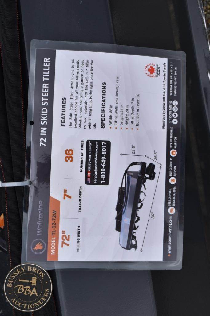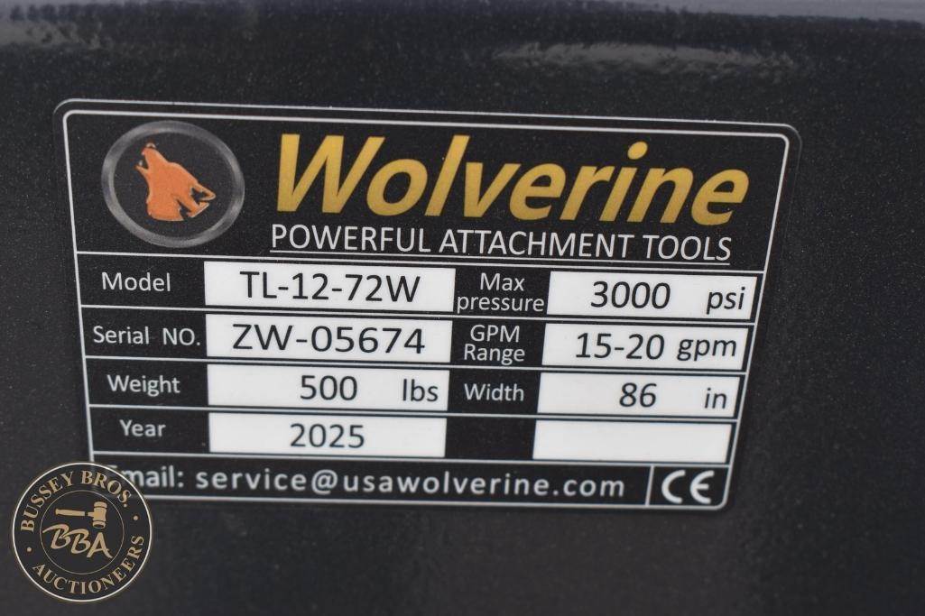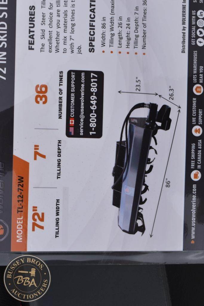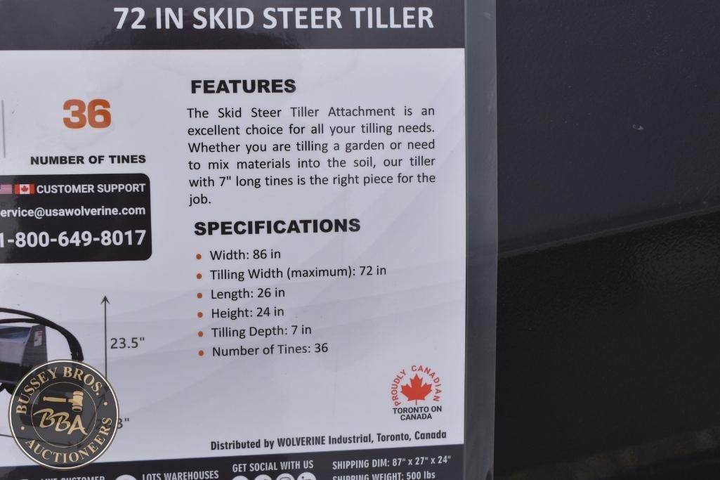 Wolverine Skid Steer Tiller Attachment Skid Steer Mount, tiller, hydraulic, 72in tilling width, 7in tilling depth, 36 tines, TL-12-72W, SN#ZW-05674, NEW/UNUSED