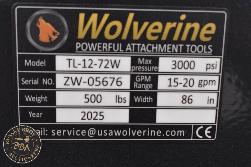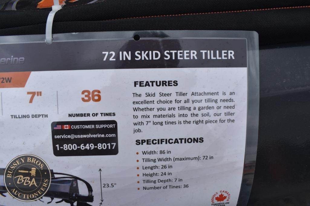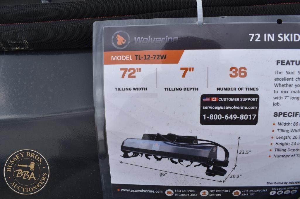 Wolverine Skid Steer Tiller Attachment Skid Steer Mount, tiller, hydraulic, 72in tilling width, 7in tilling depth, 36 tines, TL-12-72W, SN#ZW-05676, NEW/UNUSED